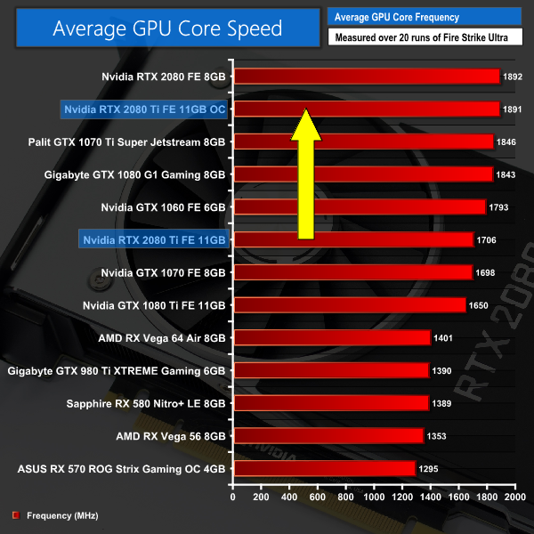 Average GPU frequency didn't quite break past 1900MHz, but we are still seeing a huge real-world frequency increase compared to stock settings. There's definitely big potential for some significant overclocks with the RTX 2080 Ti.