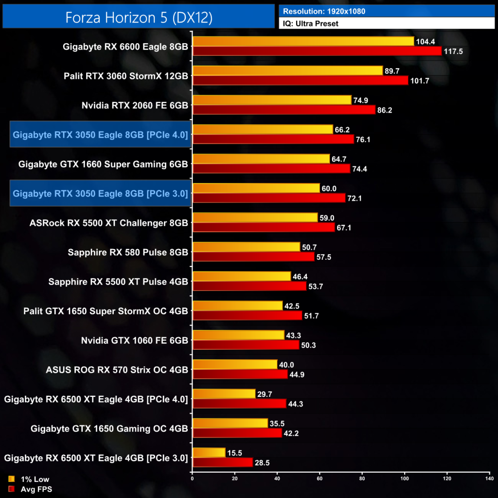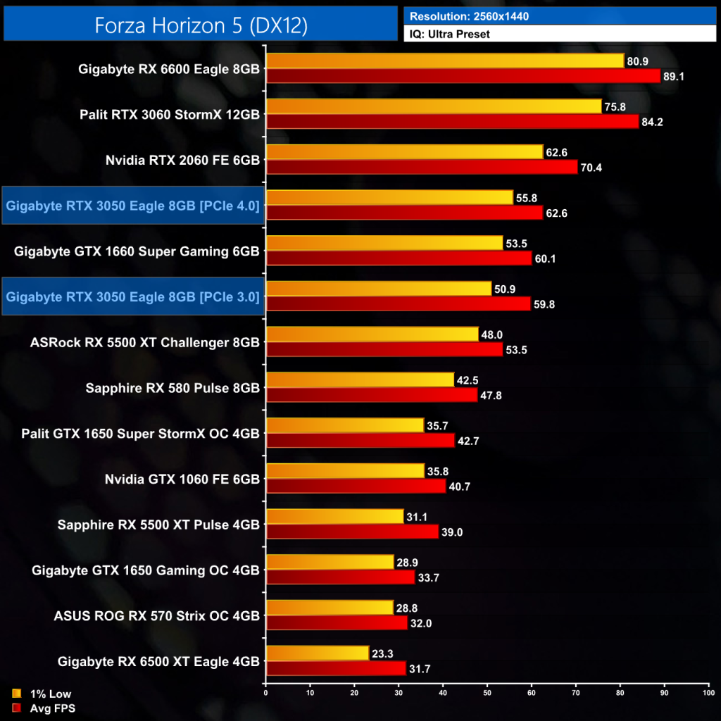 The RTX 3050 does creep back ahead of the 1660 Super in Forza Horizon 5, where it averages 76 FPS, which is not bad at all for this title. That makes it 12% slower than the RTX 2060, though frame rates do also drop by around 5% for the RTX 3050 when using PCIe 3.0. It’s only a small decrease, but it’s not nothing.