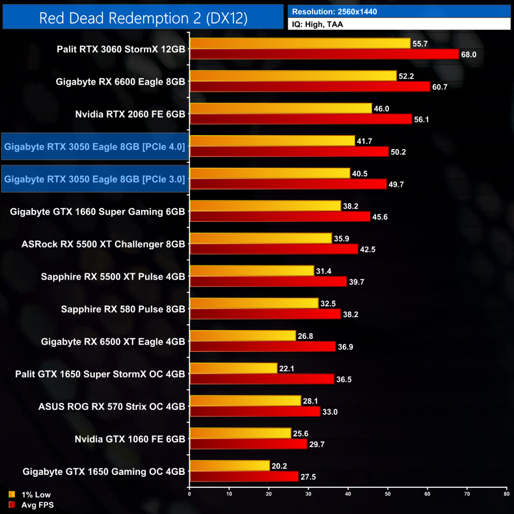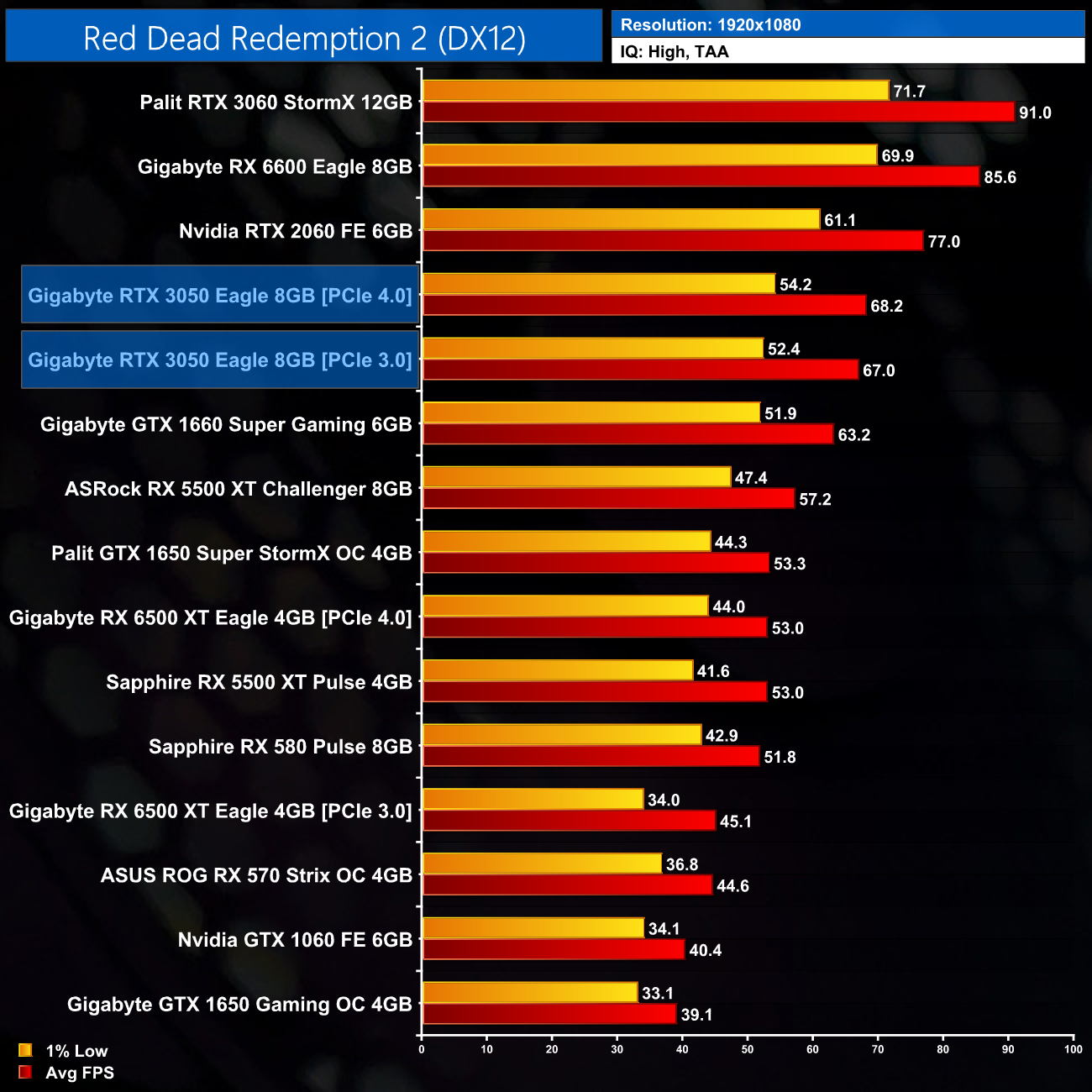 As for Red Dead Redemption 2, this shows us basically the same thing. We’re talking small improvements over the GTX 1660 Super, with the RTX 3050 just a handful of frames faster, while the RTX 2060 is a good 13% faster than the 3050. We can’t complain about overall performance, but we would have hoped for slightly more over two years on from the 1660 Super.