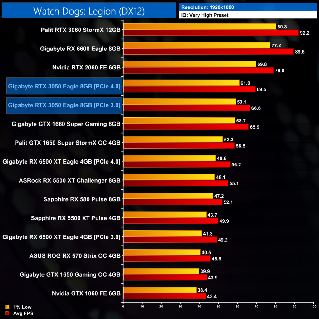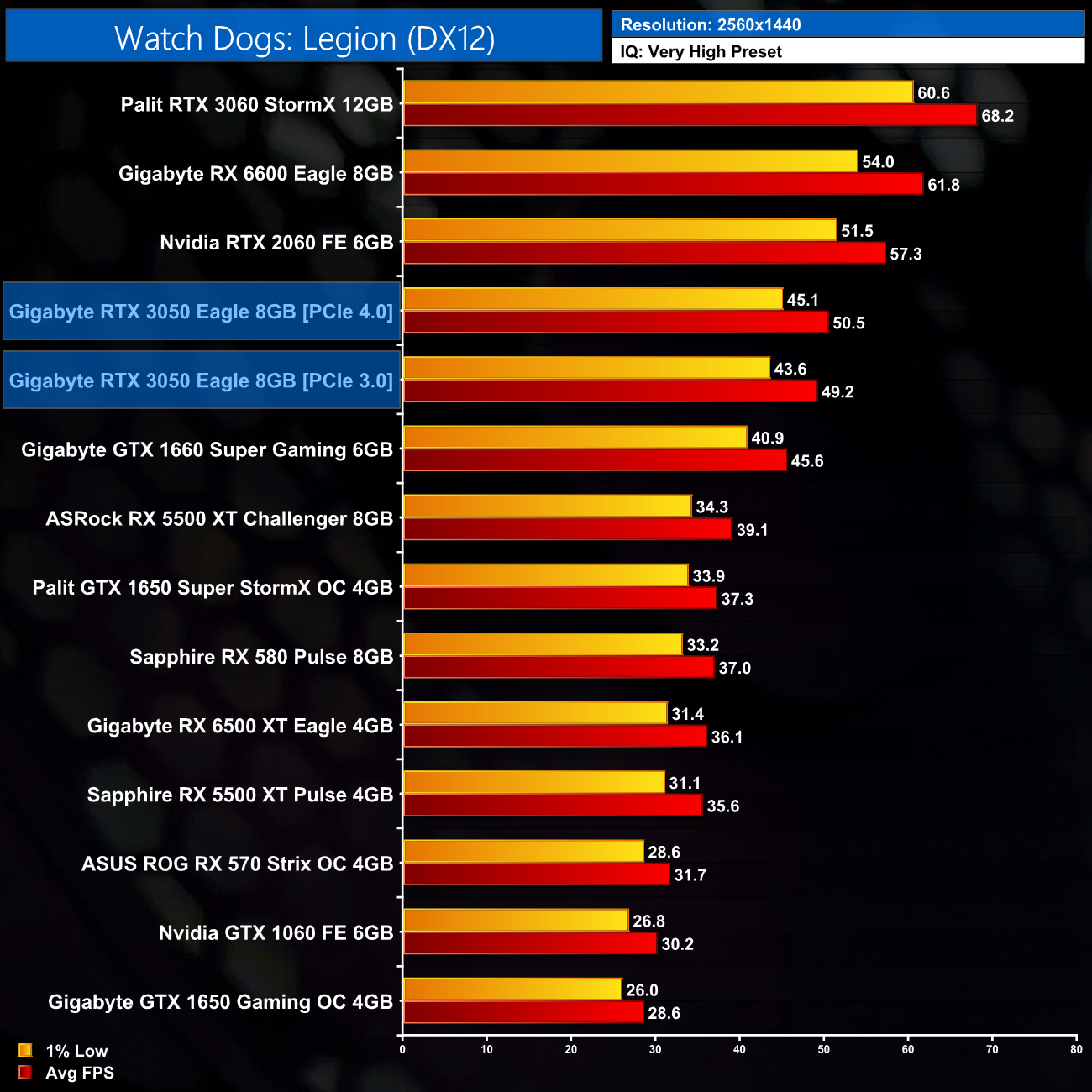 Lastly, we come to Watch Dogs: Legion and by now the results are not a surprise. The RTX 3050 is only a handful of frames faster than the GTX 1660 Super, while it’s a solid 12% slower than the RTX 2060. We can also see a small difference when testing on PCIe 3.0 as well, with performance dropping by 4% on average.
