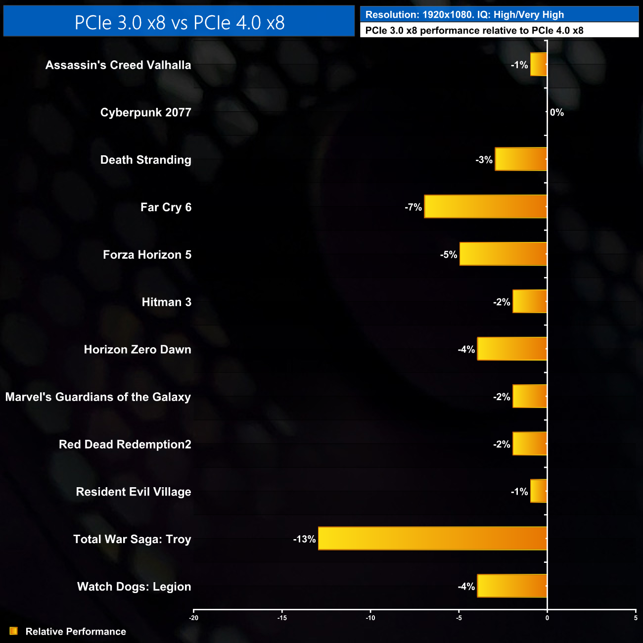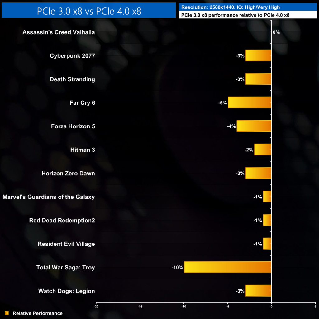 Broadly speaking, PCIe 3.0 is not going to be a limitation for the RTX 3050. In all but three of the games we tested, we saw less than a 5% differential between PCIe 3.0 and PCIe 4.0. However, the likes of Forza Horizon 5, Far Cry 6 and particularly Total War Saga: Troy do see some benefit to using this card on a PCIe 4.0 platform. Even then, the results are clearly nowhere near as disastrous as using the RX 6500 XT on a PCIe 3.0 platform, but it is worth noting.