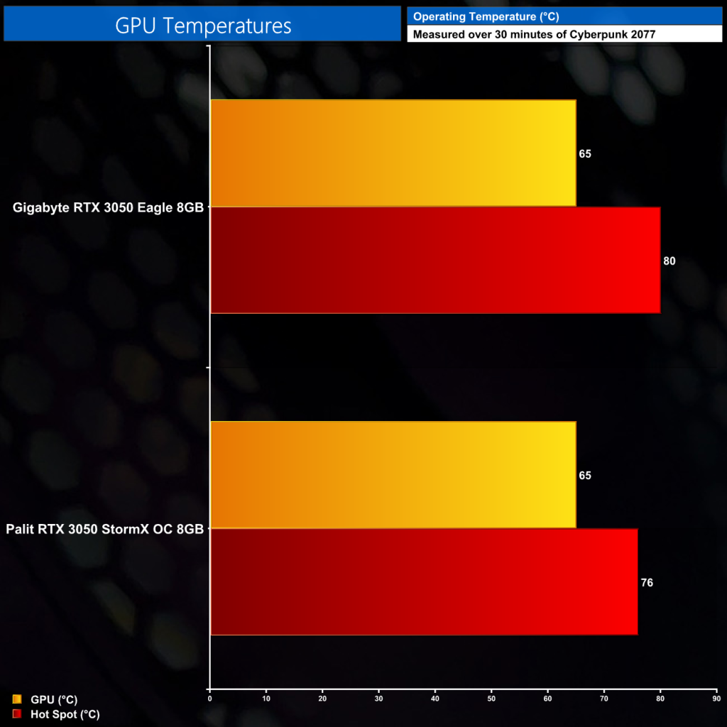 For our temperature testing, we measure the peak GPU core temperature under load. A reading under load comes from running Cyberpunk 2077 for 30 minutes.