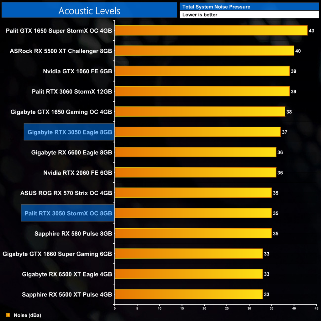 The extra heatpipes seem to help the StormX OC run its single fan at a lower speed, too. We saw the fan hit 41%, or 1270rpm, where the Eagle ramped its fans up to 1910rpm (79%), resulting in slightly higher noise levels. Neither card is what I would describe as ‘loud', but the StormX OC is a couple of decibels quieter.