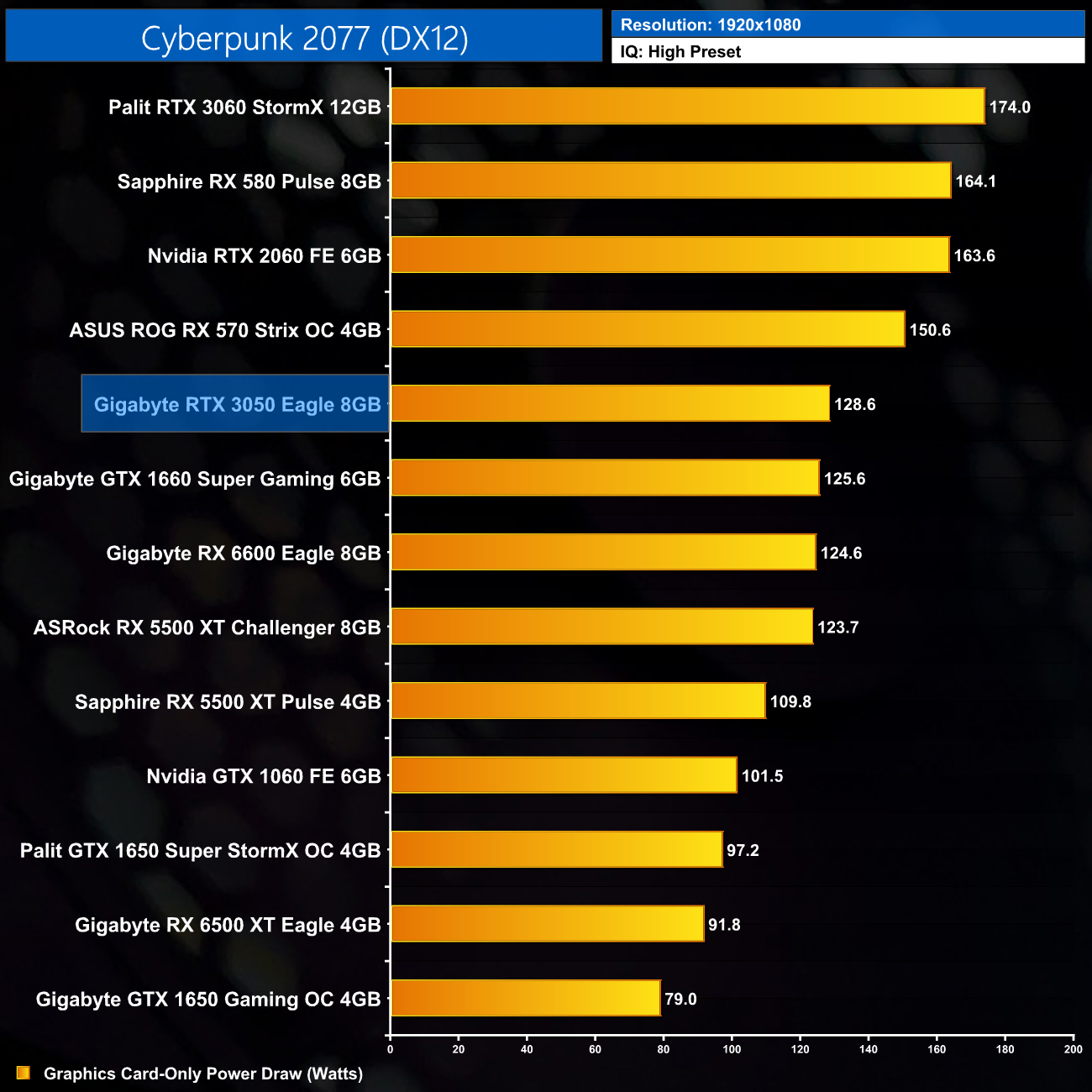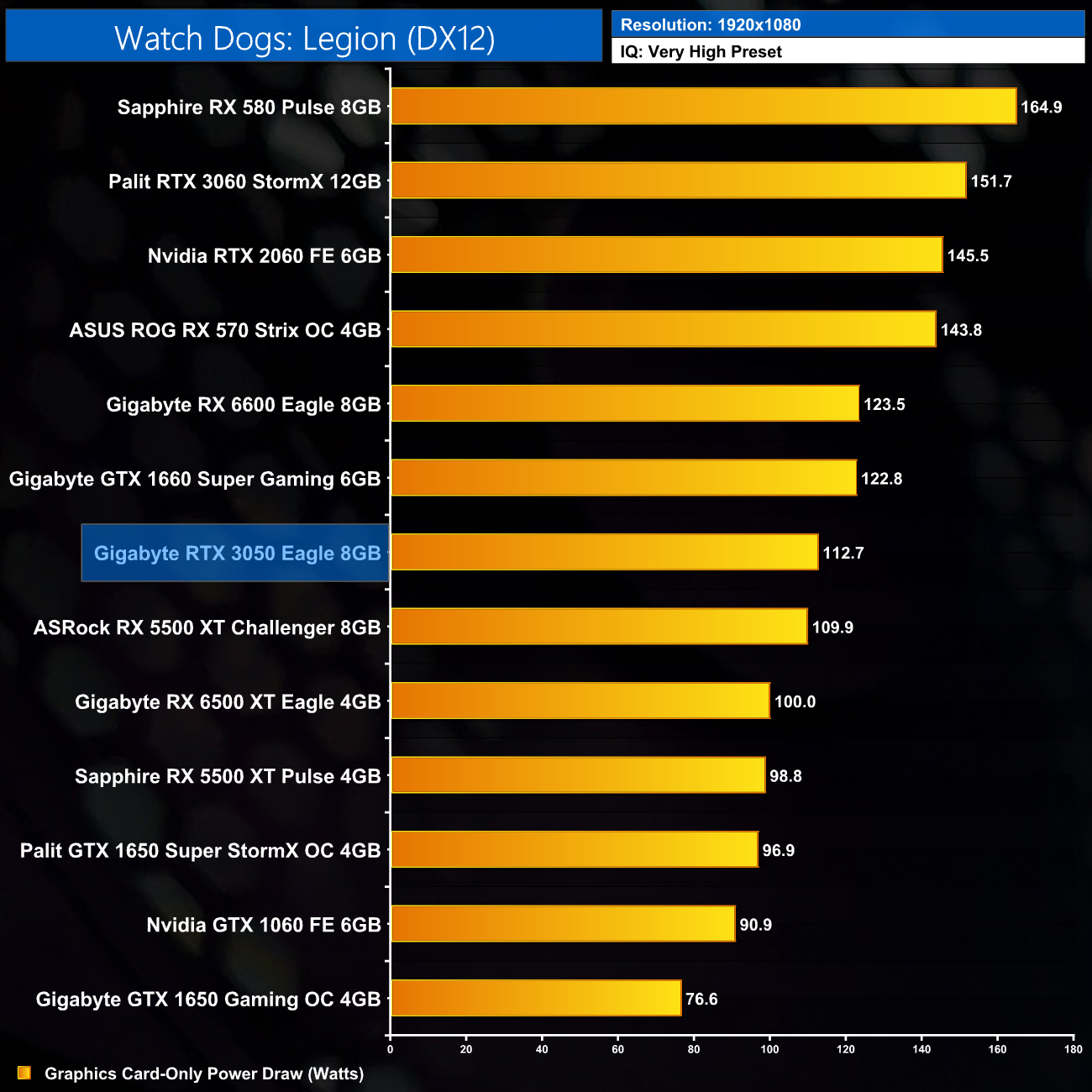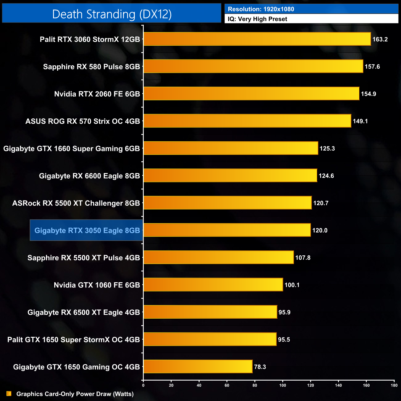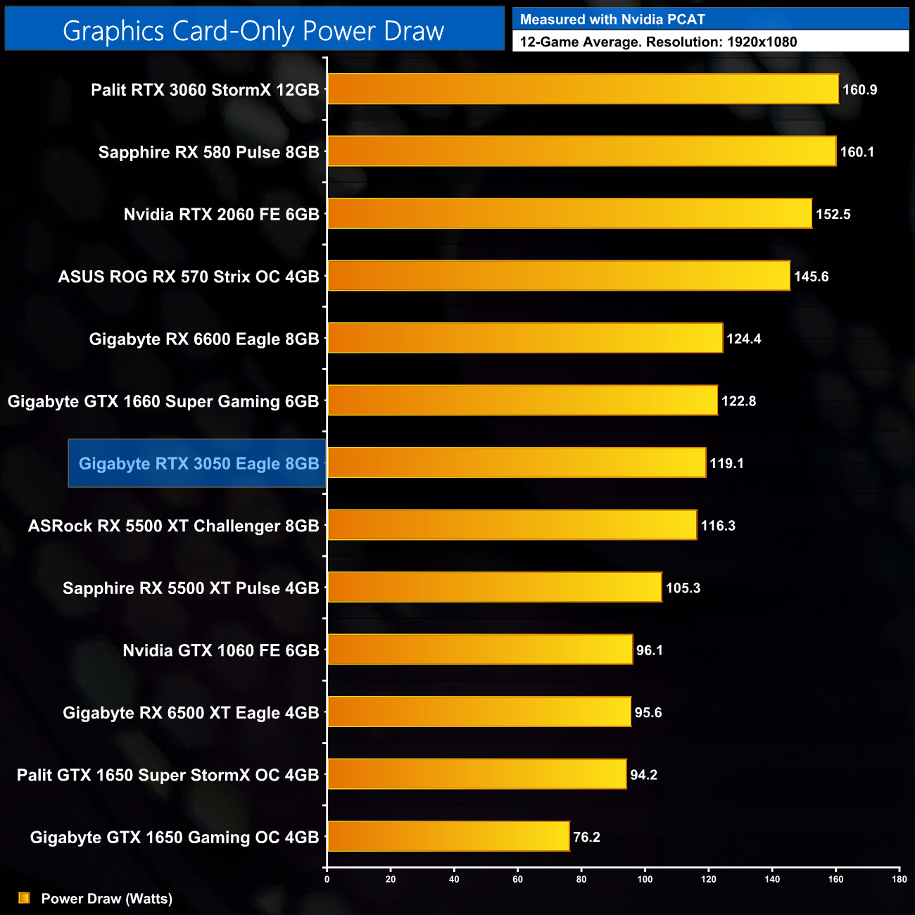 Over the twelve games we tested, the RTX 3050 averaged 119W power draw, meaning it is fractionally less power hungry than the GTX 1660 Super, and just a bit above the RX 5500 XT 8GB.