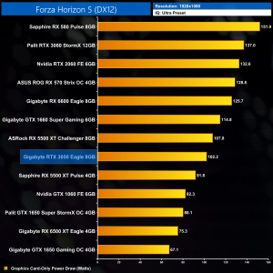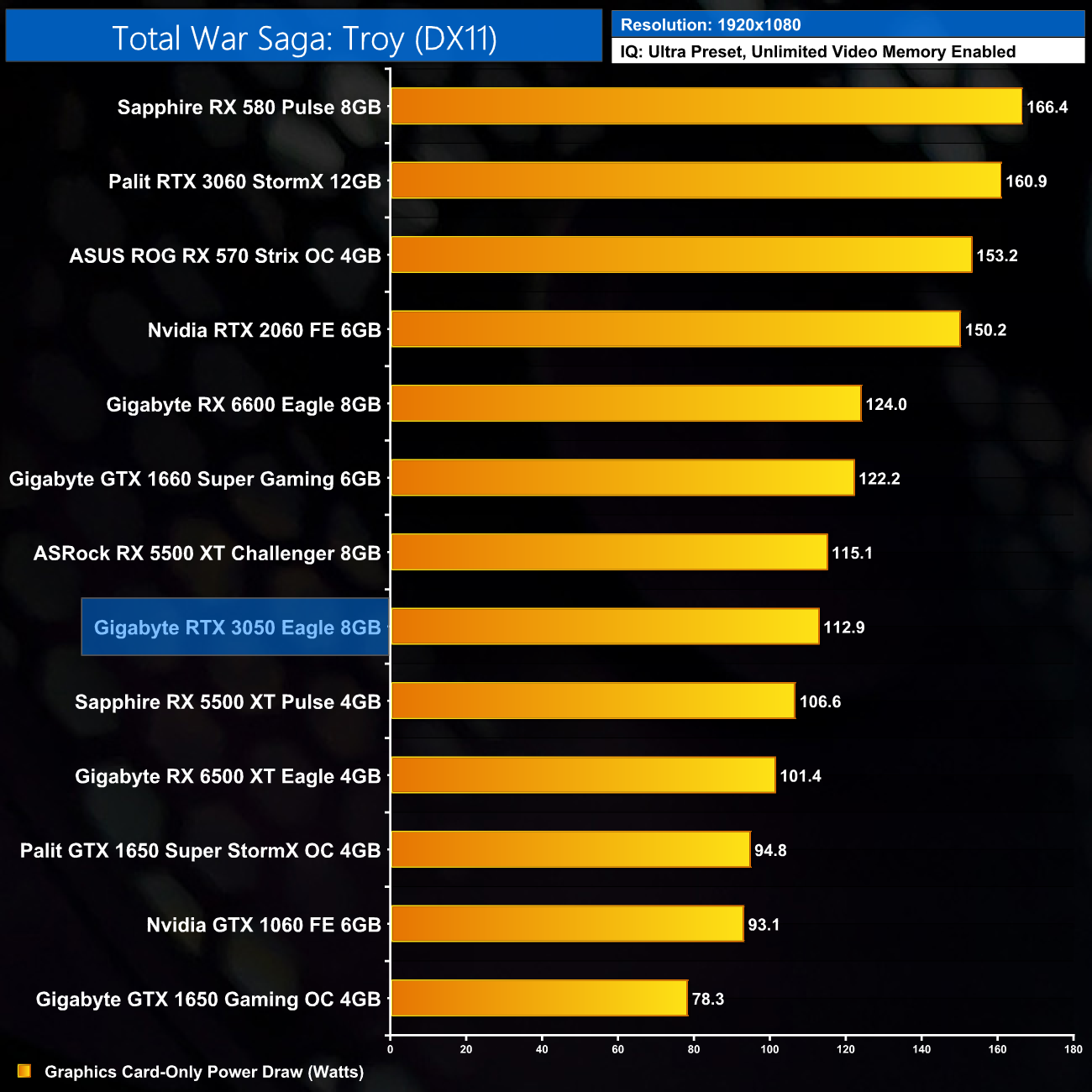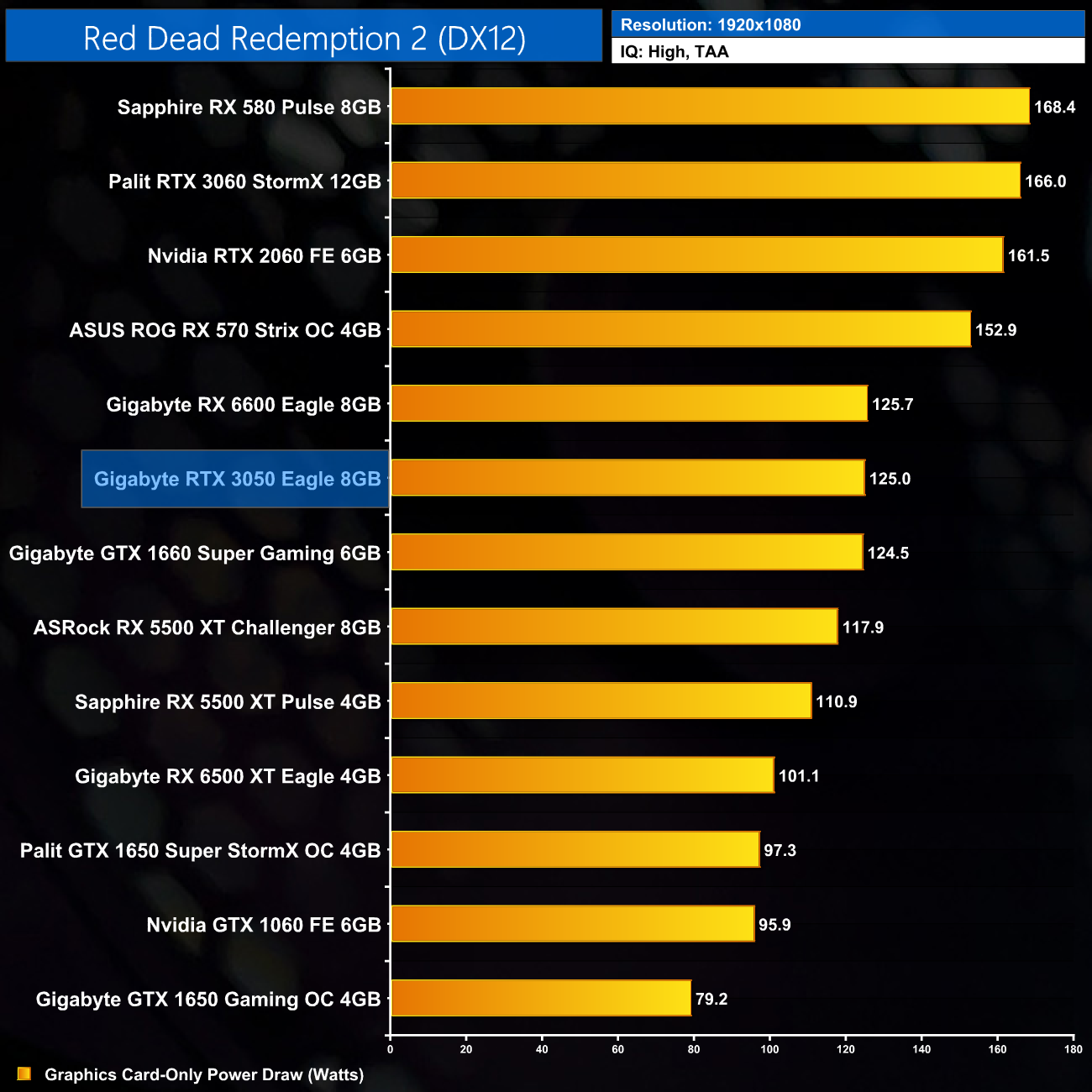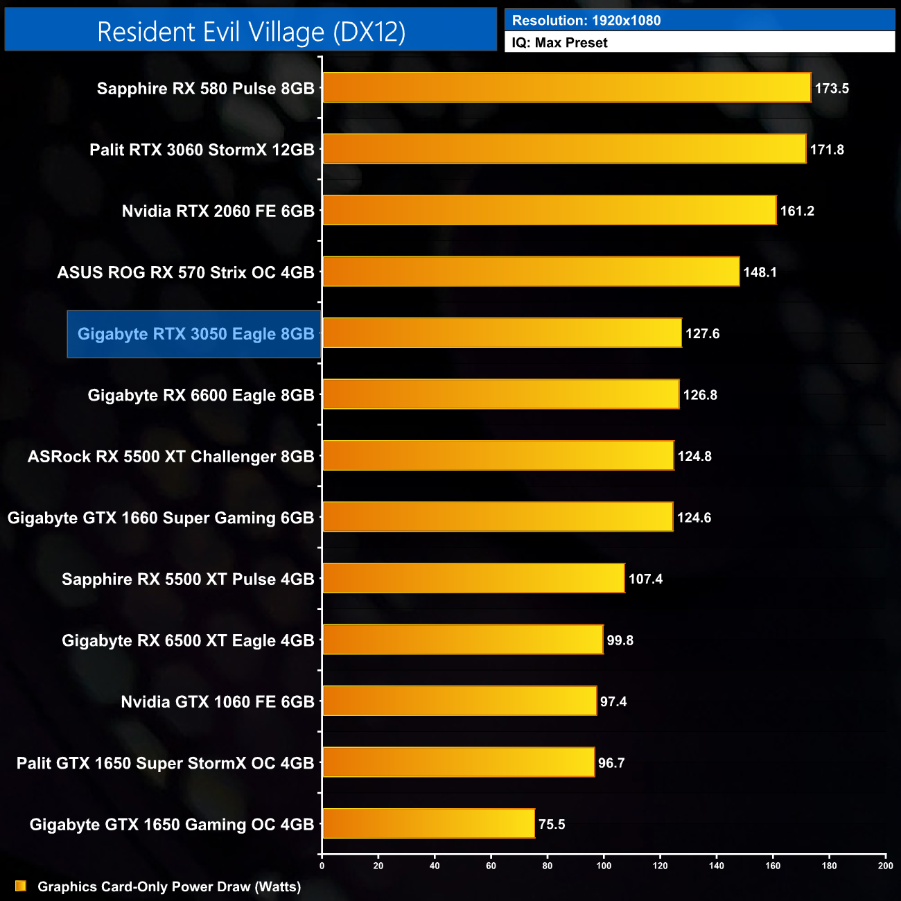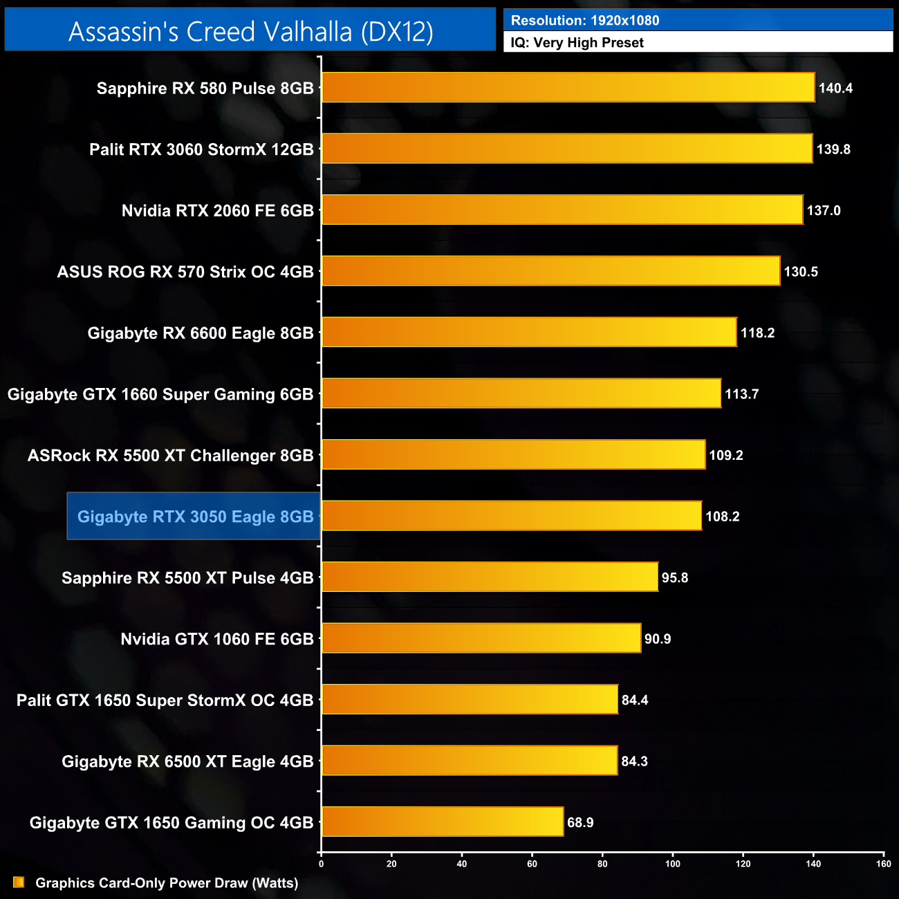 Over the twelve games we tested, the RTX 3050 averaged 119W power draw, meaning it is fractionally less power hungry than the GTX 1660 Super, and just a bit above the RX 5500 XT 8GB.