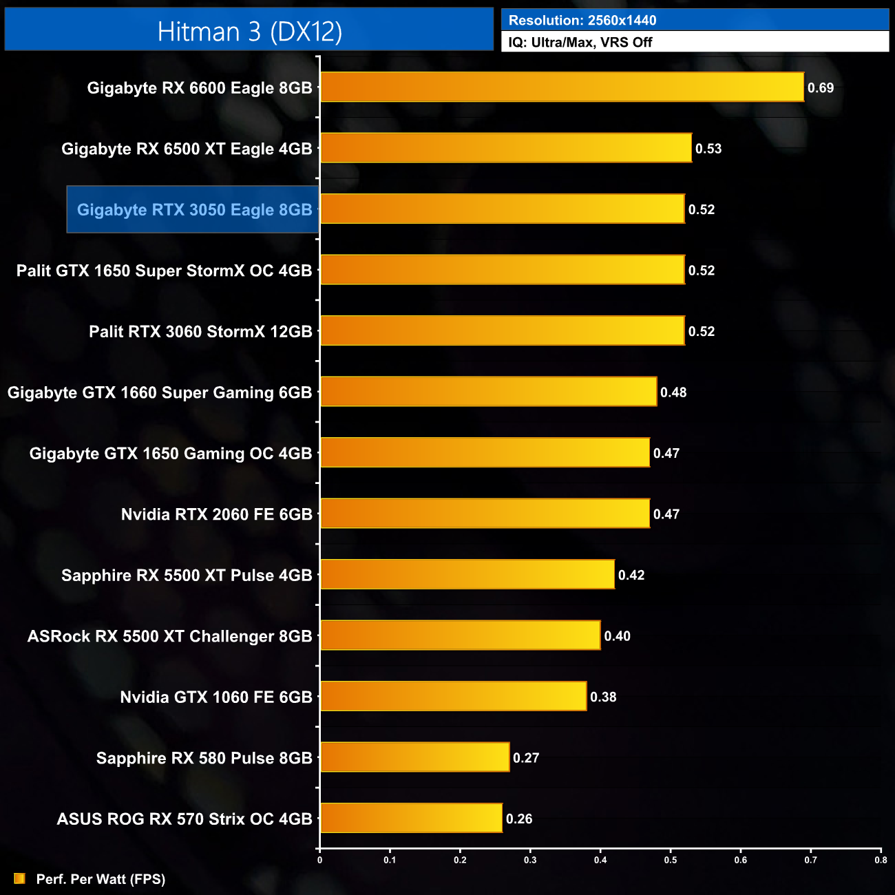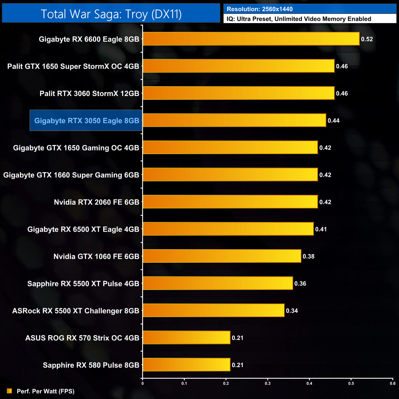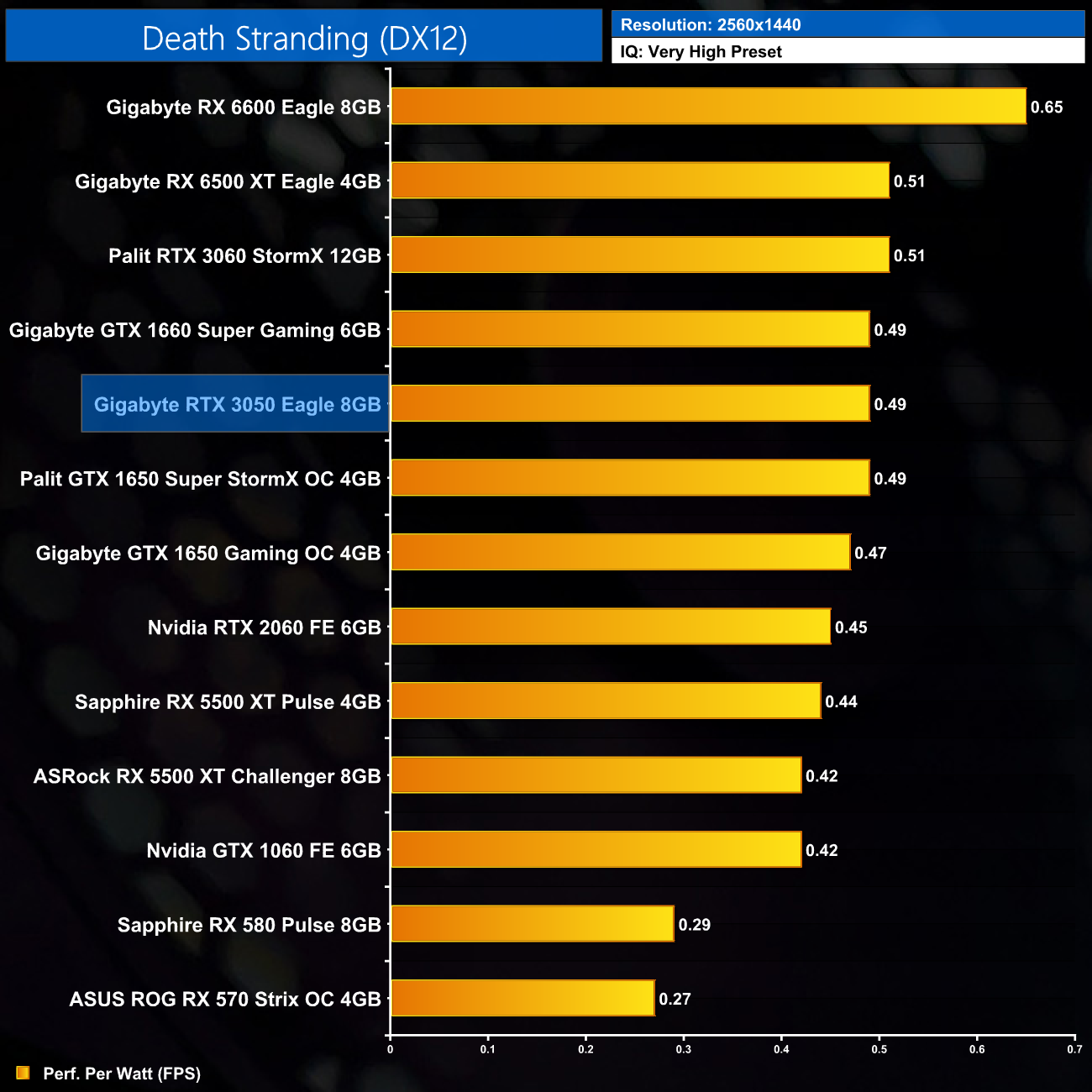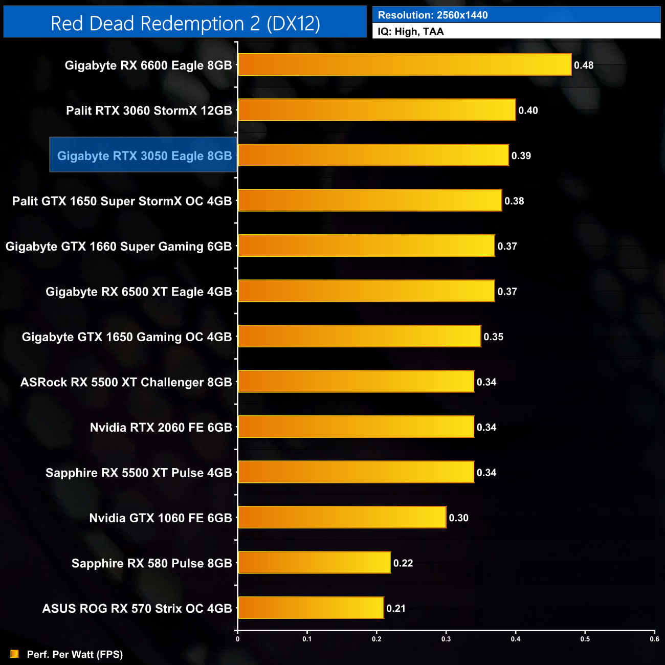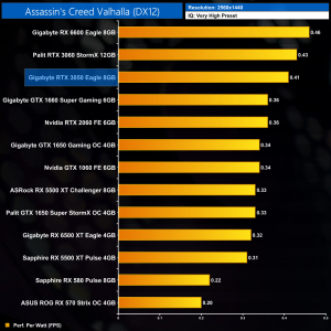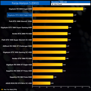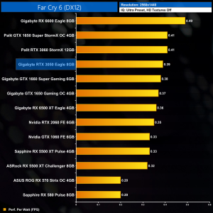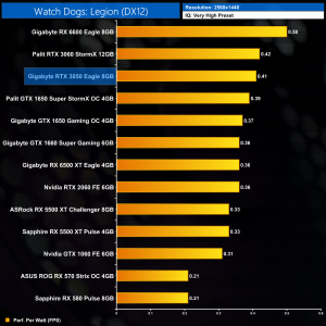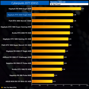 Not much changes at 1440p either. The RTX 3060 is still fractionally more efficient, while the RTX 3050 offers less than 5% more performance per Watt than the GTX 1650 Super.