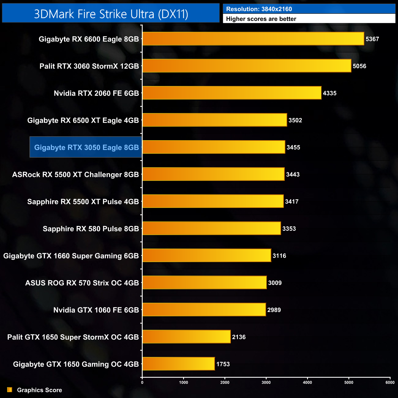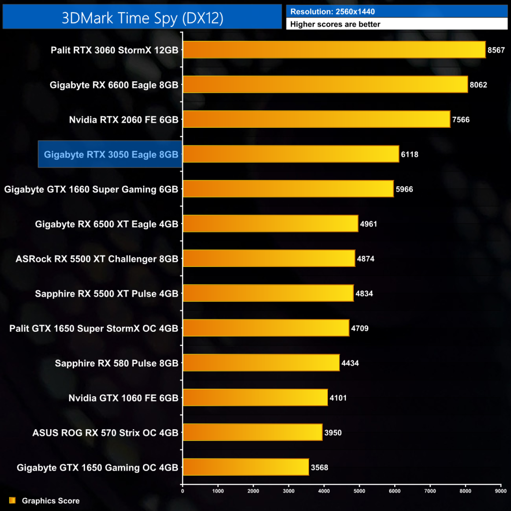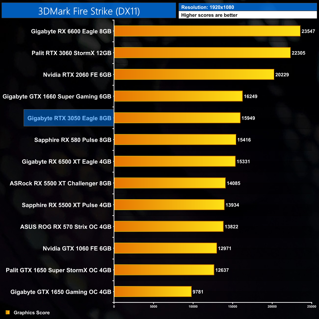 Kicking off with our 3DMark testing, the RTX 3050 doesn't make the best of starts here. It's beaten by the GTX 1660 Super in Fire Strike and is only just ahead of the RX 580. Time Spy does look a bit better however, with the RTX 3050 now edging ahead of the GTX 1660 Super, but it's still well behind the RTX 2060.