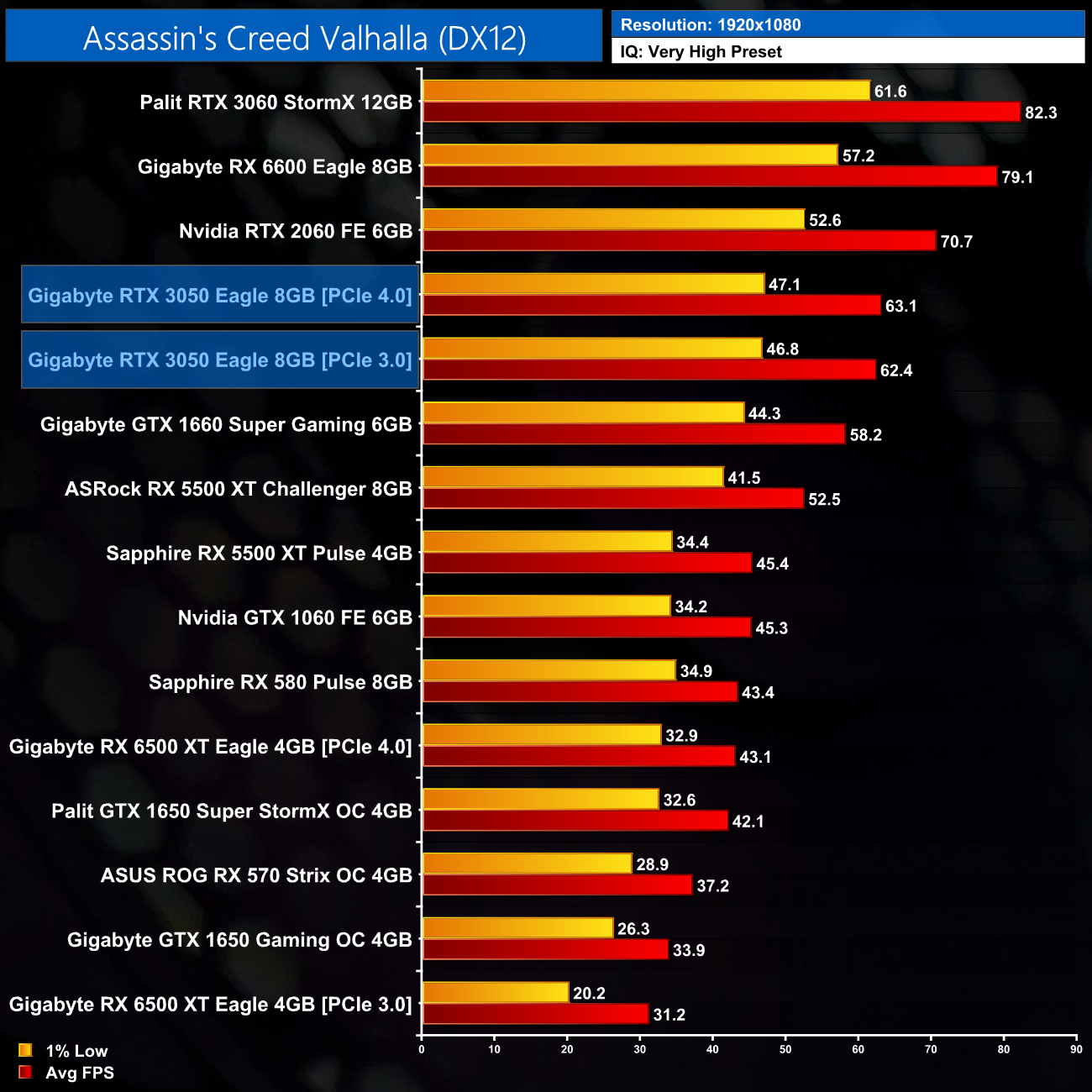 Starting the game benchmarks with Assassin’s Creed Valhalla, at 1080p we can see the RTX 3050 delivers 63 FPS on average. That puts its pretty neatly between the GTX 1660 Super and the RTX 2060, as it’s 8% faster than the former but 11% slower than the latter. We can also see no practical difference when testing with PCIe 3.0 either.