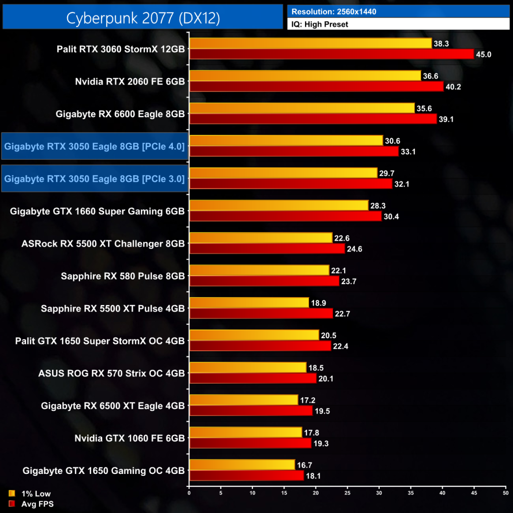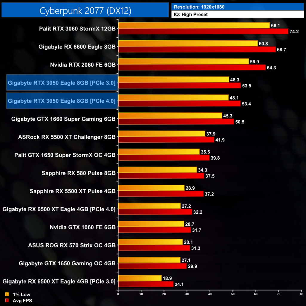 As for Cyberpunk 2077, it is a pretty similar situation overall. The RTX 3050 is beating out the GTX 1660 Super by 6%, though in practice that’s only a difference of 3 FPS so it’s hardly a game changer. The RTX 3050 also a decent amount slower than the RTX 2060, coming in 17% behind, but again we’re seeing no difference when dropping PCIe speeds down to Gen3.