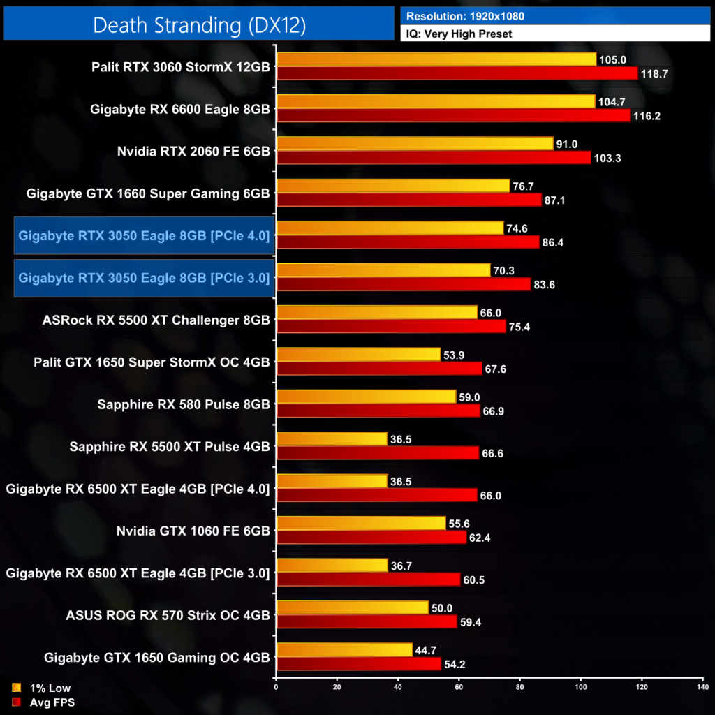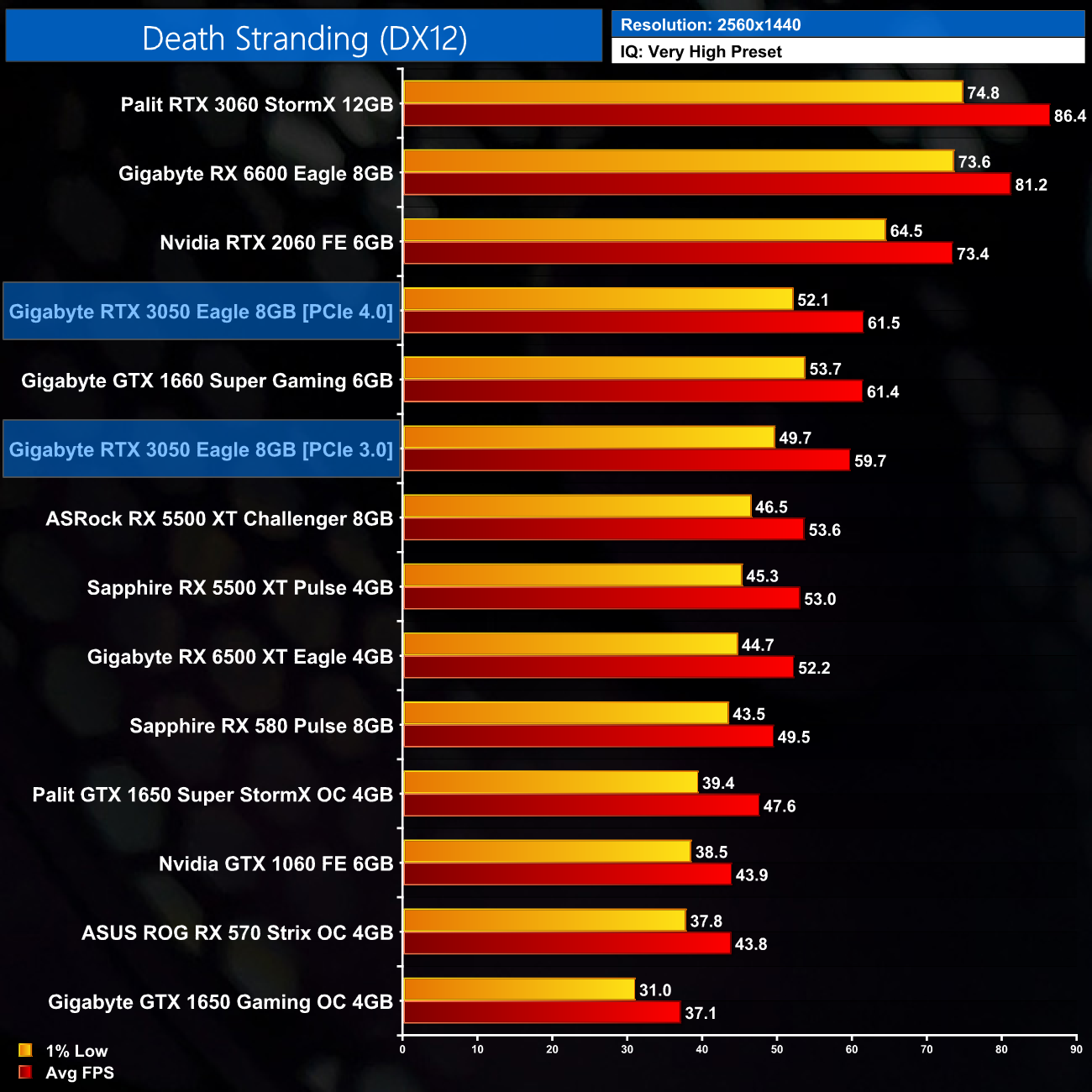 Death Stranding puts the RTX 3050 even closer to the GTX 1660 Super, and in fact the 3050 is marginally slower here… but we’re talking less a single frame, so that means they are just as fast as each other. That said, using the RTX 3050 with PCIe 3.0 did see a reduction in performance – it's only slight, but the 1% lows came down by 6% which is definitely outside our margin for error.
