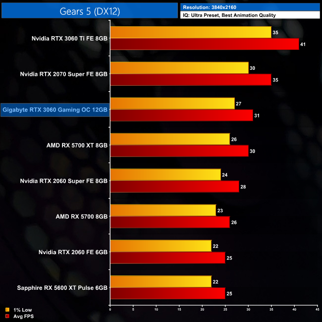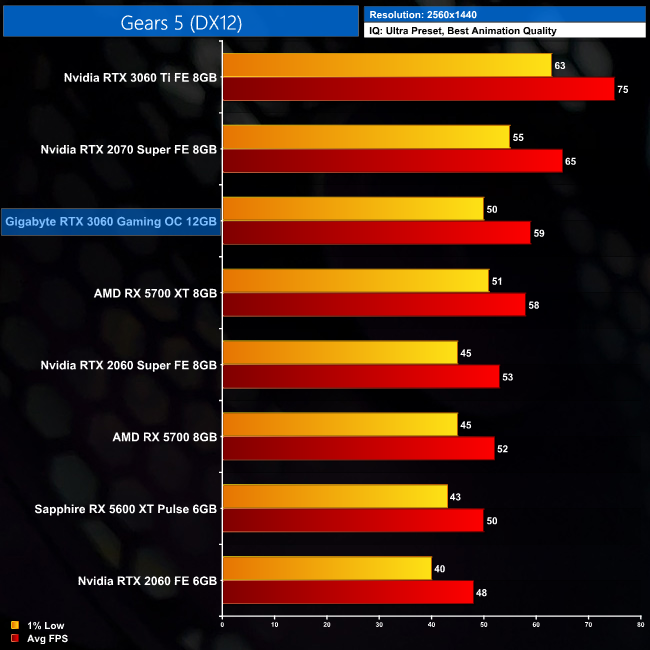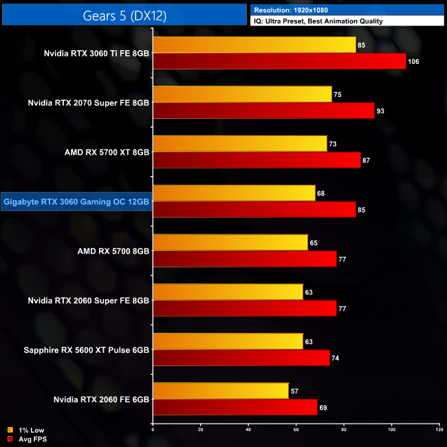 Gears 5 is a lot tougher on the GPU than F1 2020, and at 1080p we see 85FPS on average for the RTX 3060. Despite this being an AMD-sponsored title, that makes the 3060 10% faster than the RX 5700, while it's only just behind the RX 5700 XT. Against the RTX 2060, we're looking at an extra 23% performance.
