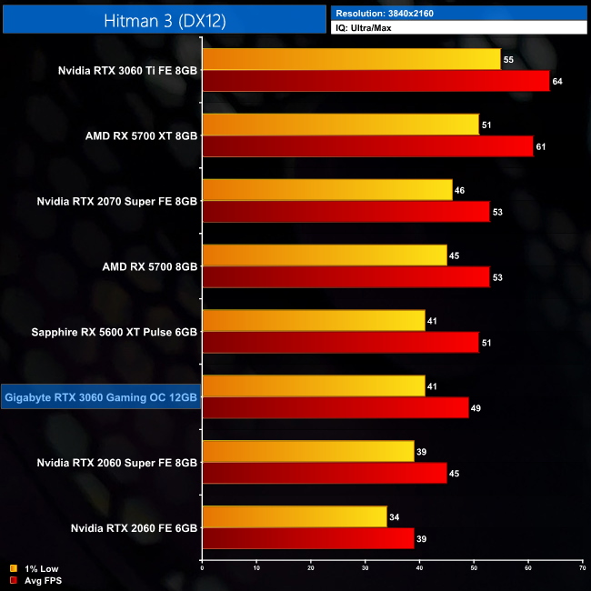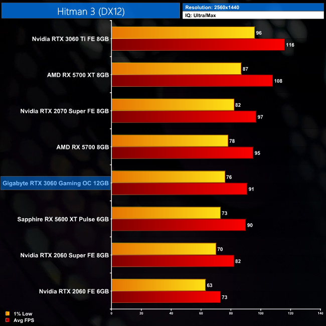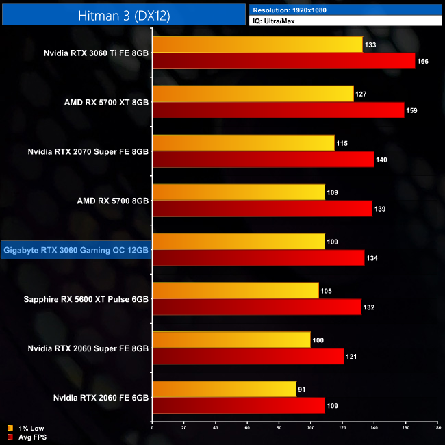 Next we come to Hitman 3, a pretty new game and despite not being sponsored by either AMD or Nvidia, it is AMD GPUs which perform a lot better than expected in this title. The RTX 3060, for instance, is 4% slower than the RX 5700 here and only fractionally ahead of the RX 5600 XT at 1080p.