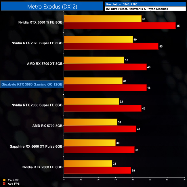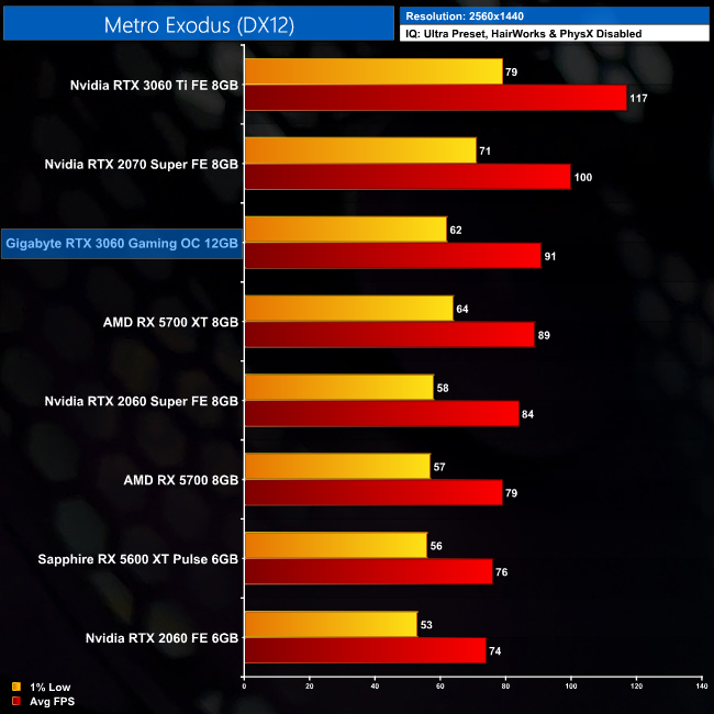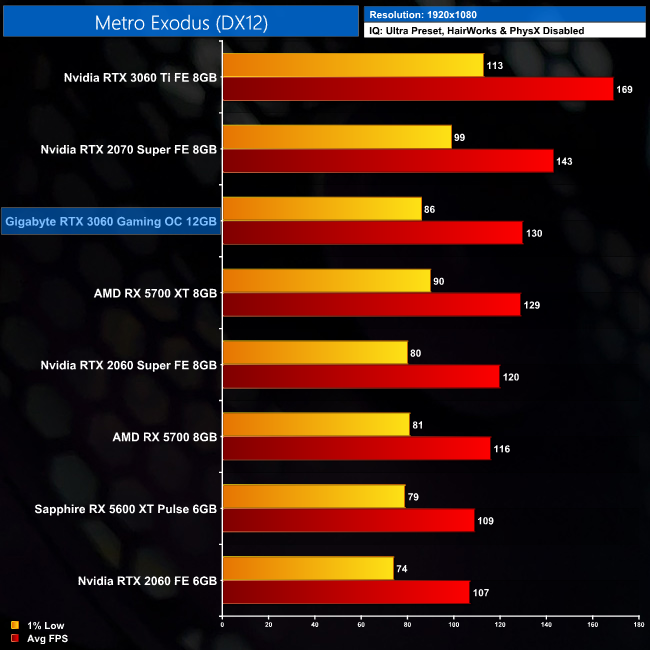 Next we come to Metro Exodus. This turns the tide back towards the RTX 3060, as at 1080p it is level with the RX 5700 XT but 12% faster than the RX 5700. Gen-on-gen, we're looking at another 21% boost versus the RTX 2060.