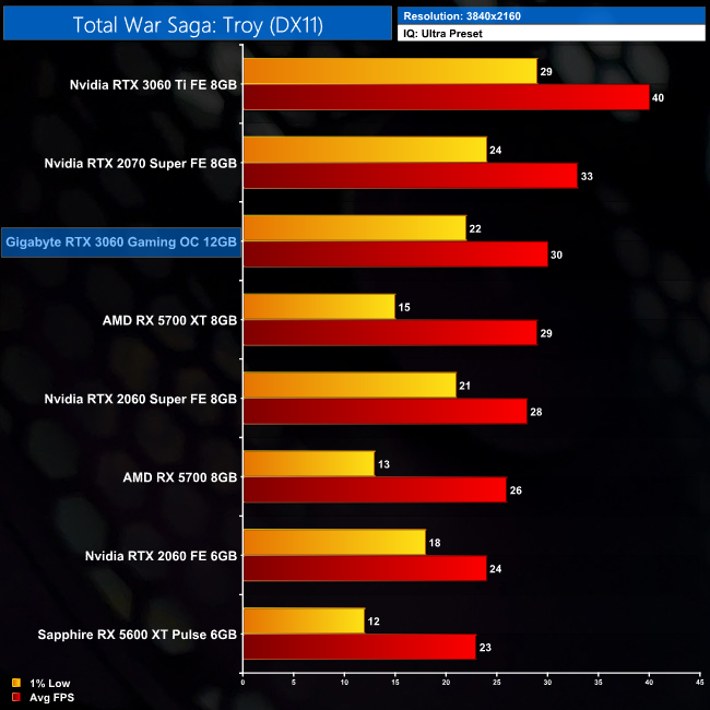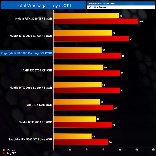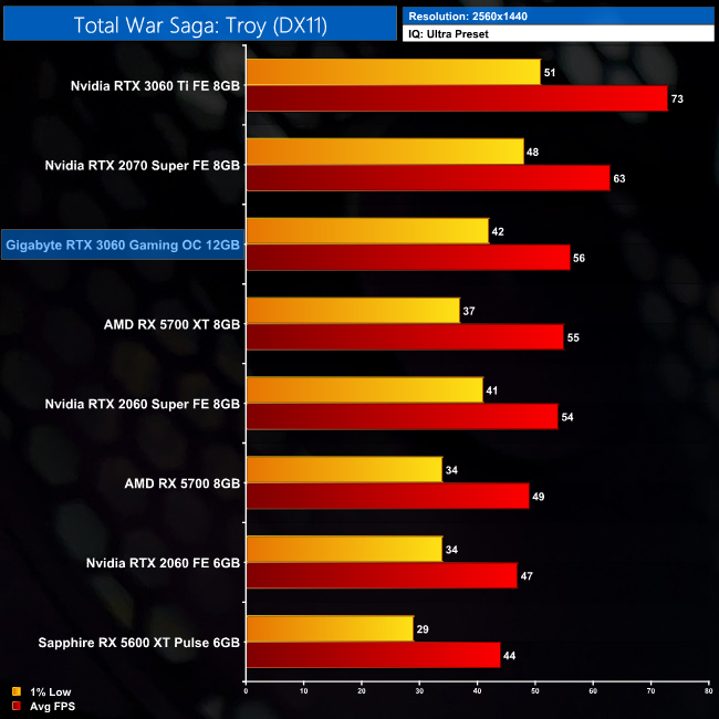 Second to last, we have Total War Saga: Troy. This DX11 title sees the RTX 3060 once more ahead of the RX 5700 by a decent margin – 13% at 1080p – while it's basically on-par with the RX 5700 XT. Compared to the RTX 2060 however, scaling isn't as impressive here, as the Ampere GPU is 16% faster than its predecessor.