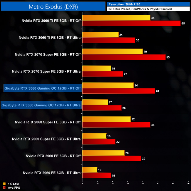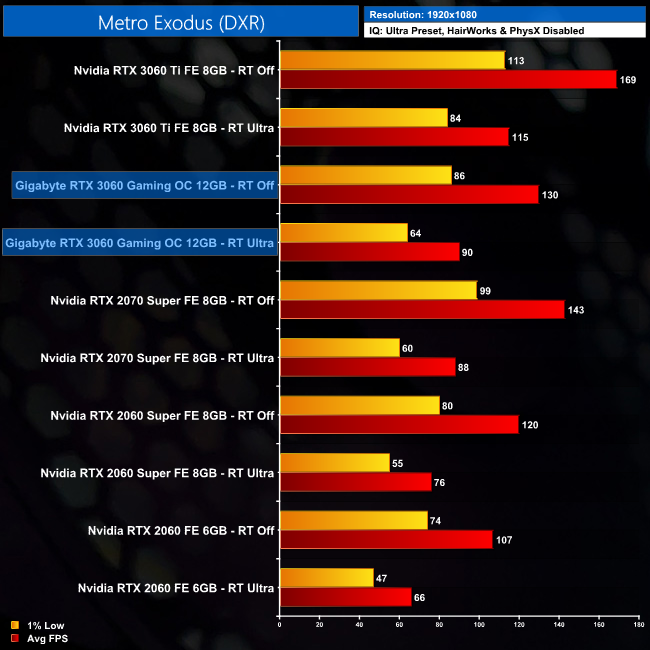 Metro Exodus' ray traced global illumination isn't quite so demanding, as we see a 31% hit when enabling ray tracing in this title. That means the RTX 3060 averaged 90FPS with RT set to Ultra, which isn't bad and puts it on par with the RTX 2070 Super, which is the faster GPU when ray tracing is disabled.