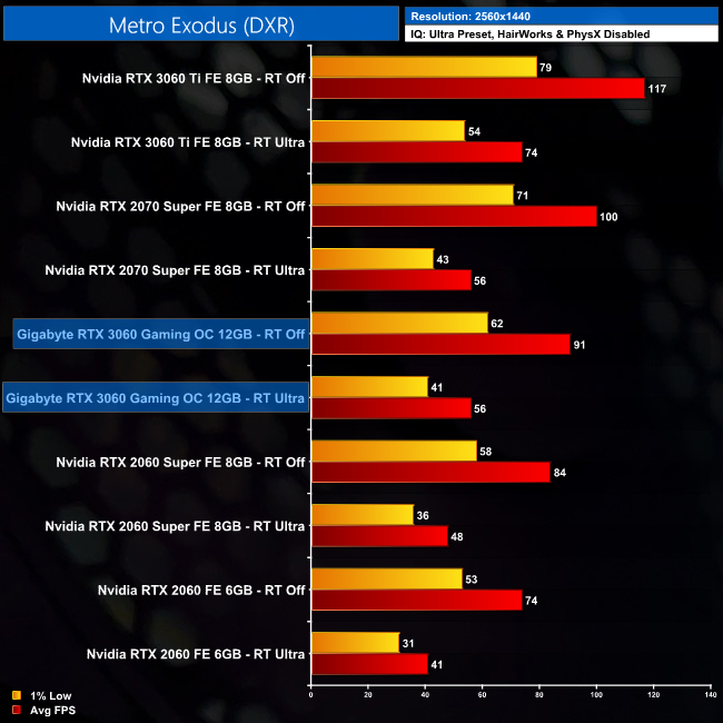 At 1440p, the RTX 3060 maintains 56FPS on average in this game, but remember there's no DLSS 2.0 support in Metro Exodus – only the blurrier DLSS 1.0.