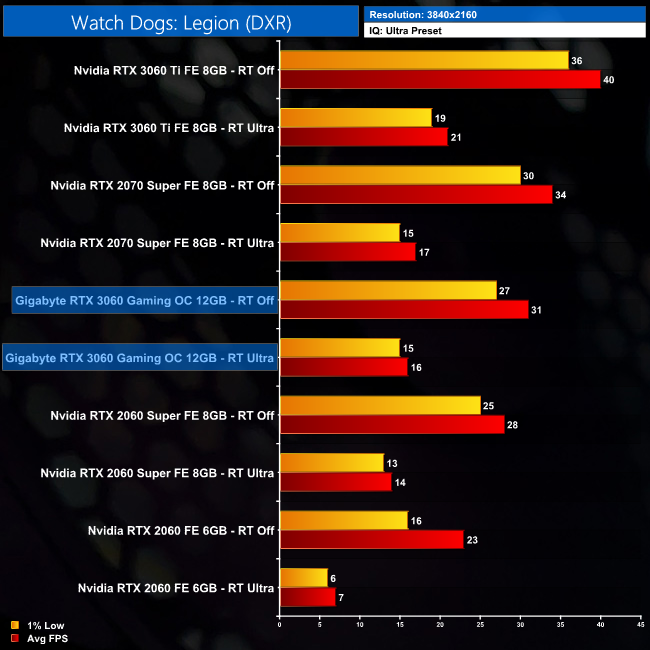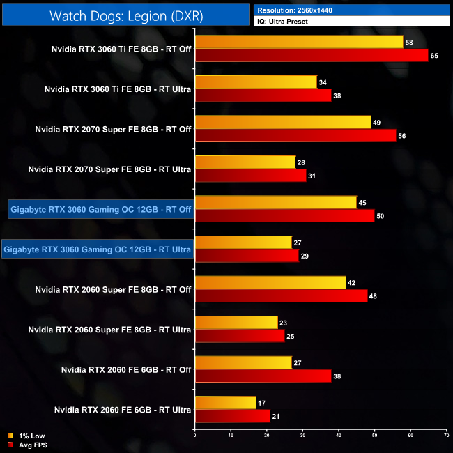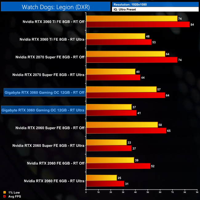 Finally we come to Watch Dogs: Legion, which uses ray traced reflections. At 1080p, enabling ray tracing sees a 36% reduction in frame rate, dropping the average FPS down to 41. That's decent scaling against the RTX 2070 Super though, as the 3060 is just 7% slower with ray tracing enabled, when it's 14% slower with ray tracing disabled.