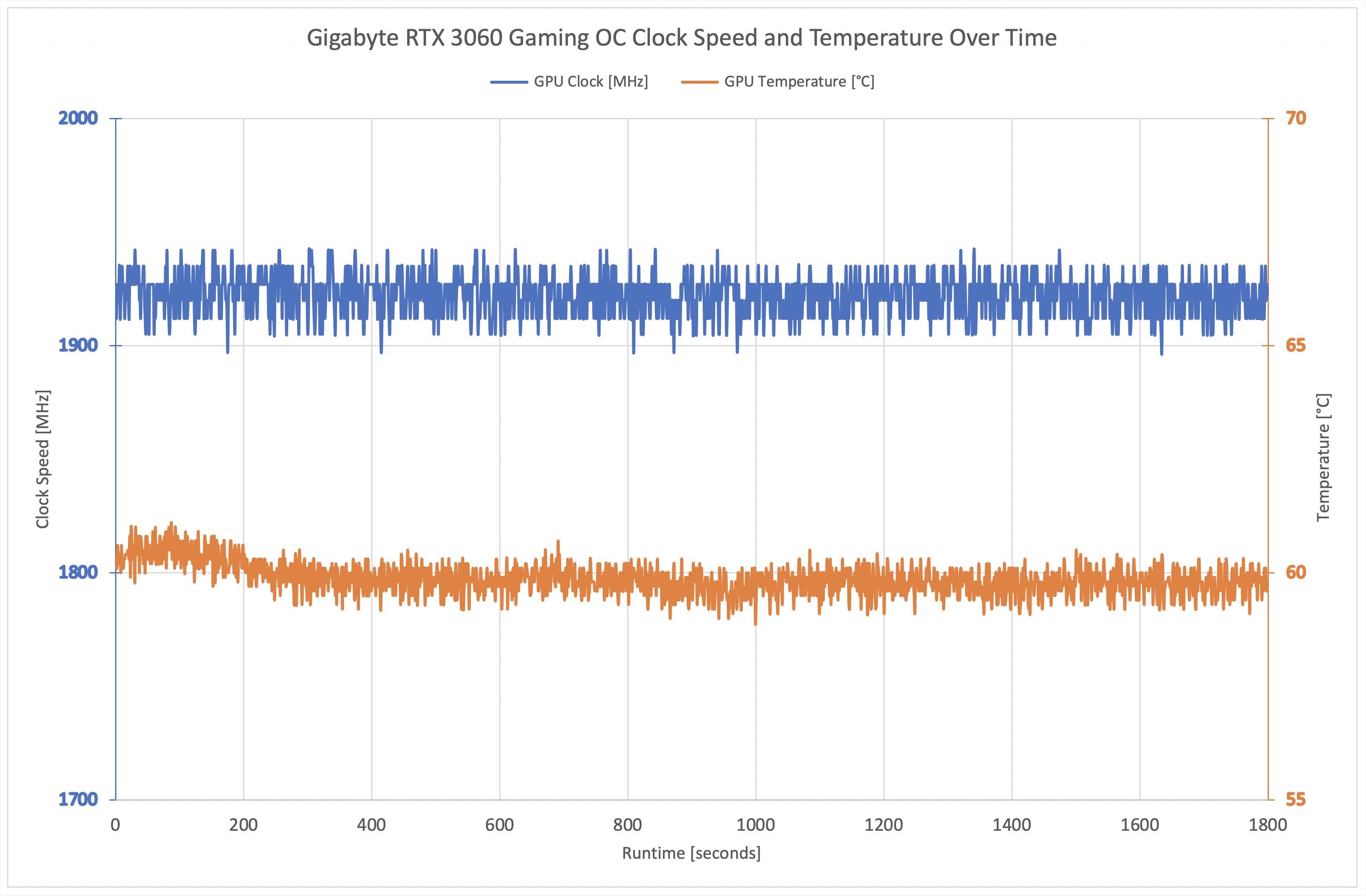 Reference RTX 3060 has a rated boost clock of 1777MHz, but the Gaming OC has increased that to 1837MHz. In the real world, the GPU ran solidly above 1900MHz, dipping below on just a handful of occasions. Averaged over the 30 minute session, the card hit 1922MHz. You can see from the graph above just how consistent the clock behaviour was.