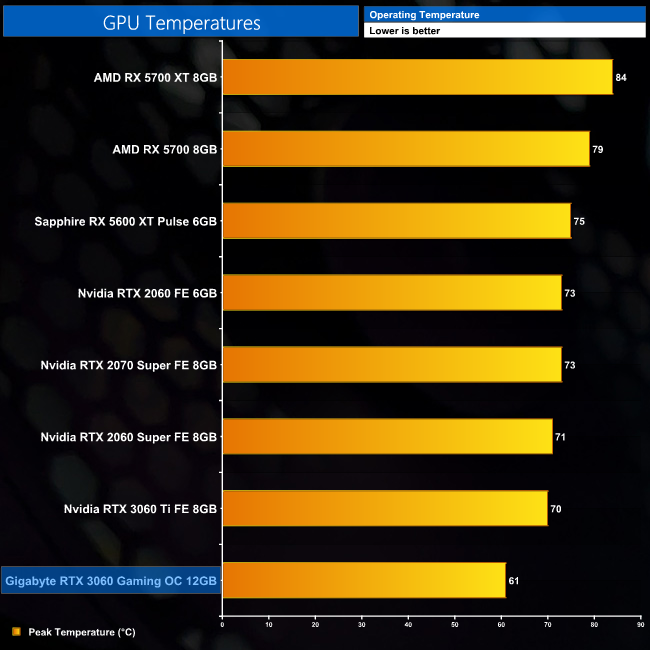 As our first RTX 3060 card, we don't have much context as to how good the Gaming OC's cooler is, but hitting a peak of 61C for the GPU temperature is clearly an objectively excellent result. It will be fascinating to see how other, smaller cards can handle the GA106 GPU in the coming weeks.
