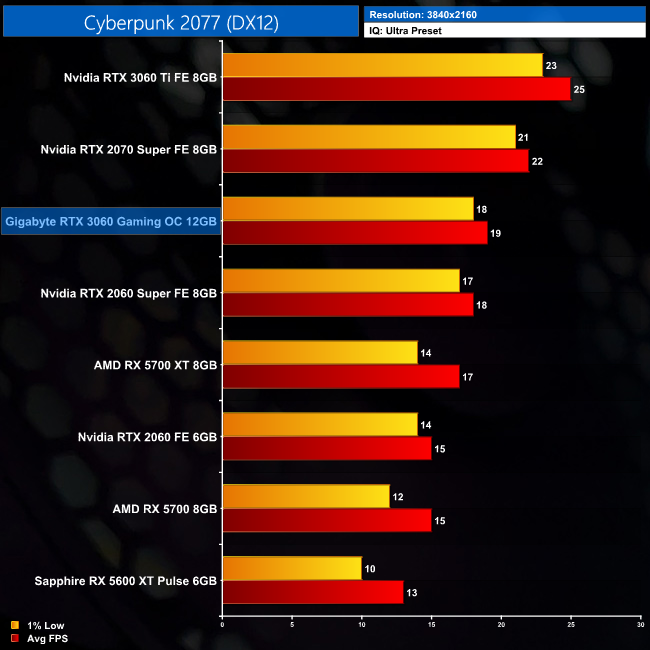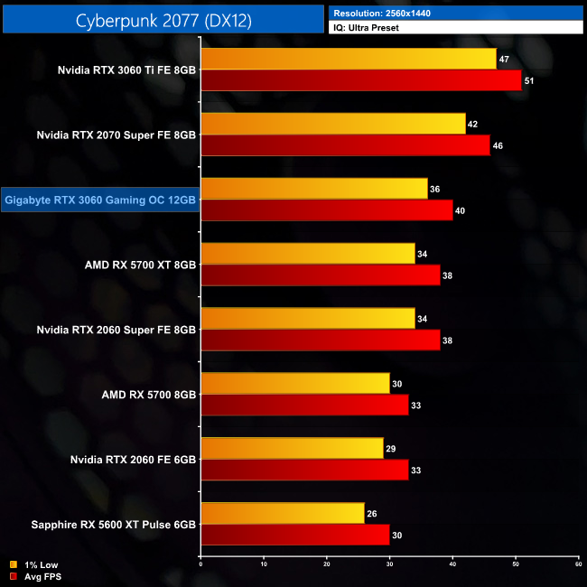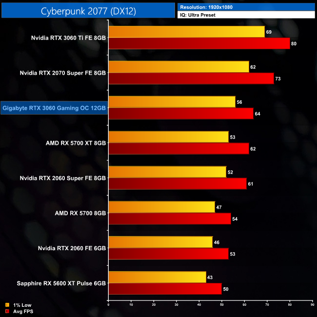 As one of the most demanding games in our suite, it's a great indicator of overall performance to see the RTX 3060 averaging 64FPS in Cyberpunk 2077. This puts it 3% ahead of the RX 5700 XT an 21% ahead of the RTX 2060.