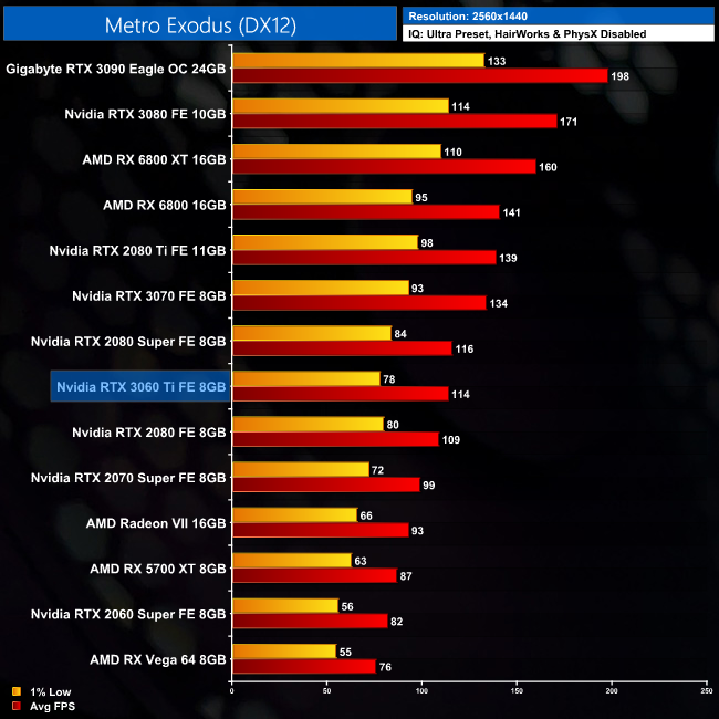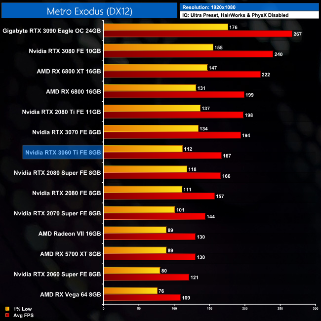 As for Metro Exodus, things are effectively a draw between the 3060 Ti and 2080 Super in this title. At 1080p, there is a single frame difference between the two GPUs, while the 3060 Ti is 38% faster than the 2060 Super.