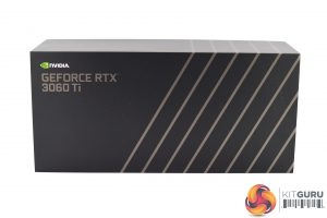 The RTX 3060 Ti Founders Edition ships in the same style of box we have seen from the other 30-series GPUs – it's almost entirely black, with some silver lines drawn on the front, with the GeForce branding visible in the top left corner.