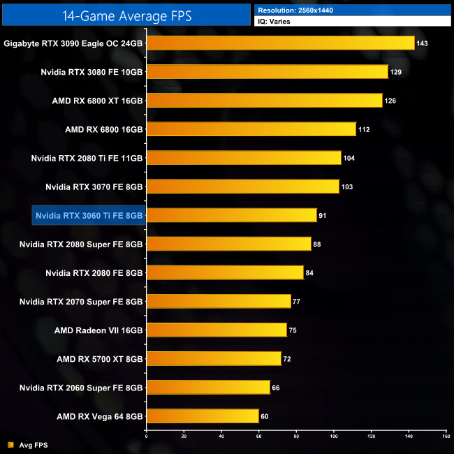 At 1440p, the 3060 Ti increases on both of the leads. At this resolution, it is on average 3% faster than the 2080 Super and 39% faster than the 2060 Super.