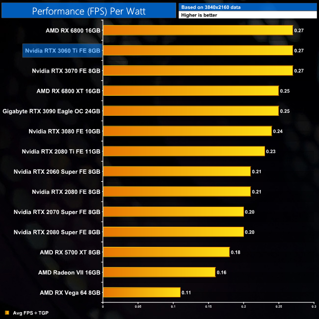 For 1080p gaming, the RTX 3060 Ti is the most efficient GPU we have tested to-date. It's not a big improvement on the RTX 3070 or RX 6800 – not at all, as it's FPS per Watt is just 3% higher. But it is still the more efficient GPU.