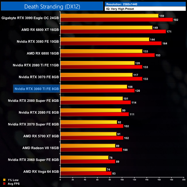 Moving on, Death Stranding is one of the least demanding games we test, and at 1080p the RTX 3060 Ti averages over 160FPS. Here, it is 4% faster than the RTX 2080 Super, but 29% faster than the 2060 Super, which is one of the smaller differences we will see today.
