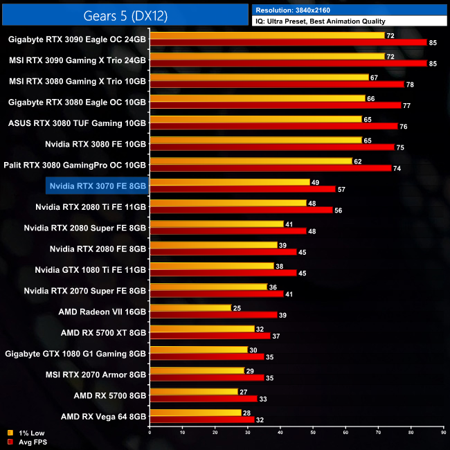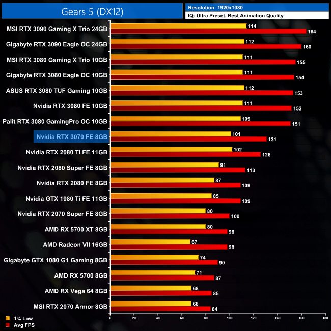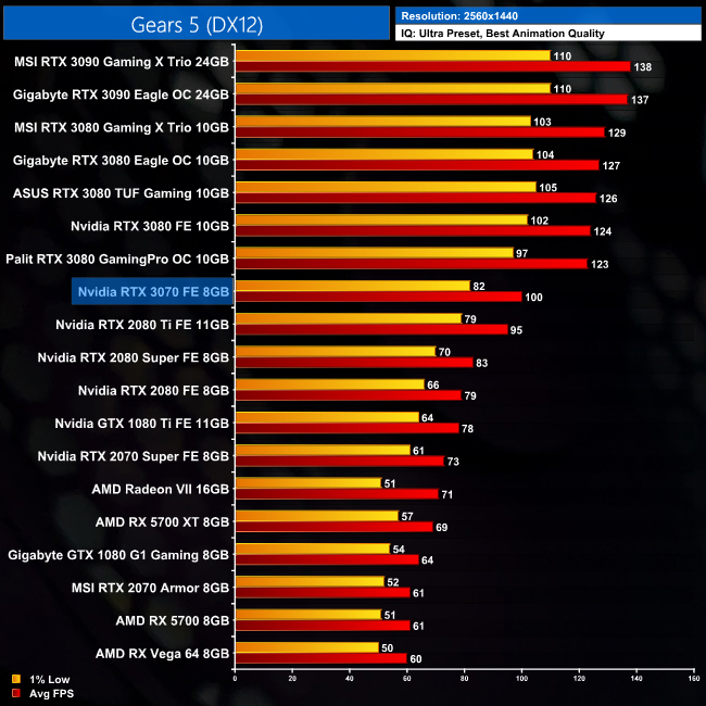 Gears 5 is another game where the RTX 3070 does well. At 1440p, the GPU hits 100FPS on average, which is a 64% improvement over the RTX 2070, and is even 5% faster than the RTX 2080 Ti. That last result is actually the biggest margin of victory we saw for the Ampere GPU compared to the 2080 Ti, so that definitely gives you an idea of how closely matched these two GPUs are.