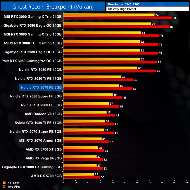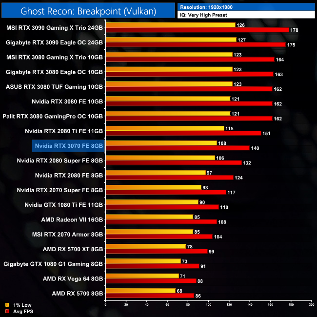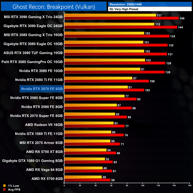 In Ghost Recon: Breakpoint, the relative performance of the 3070 isn't quite so impressive as Gears 5. It's still 44% faster than the 2070 when testing at 1440p, but that is one of the smaller improvements we will see today.