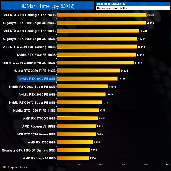 Let's kick things off with a look at 3DMark synthetic benchmarks. Here, the performance uplift for the RTX 3070, compared to the RTX 2070, ranges from 49% in Fire Strike, up to 61% in Fire Strike Ultra. Up against the RTX 2080 Ti, we can see small losses in Fire Strike and Time Spy – by 3% and 4%, respectively – before the 3070 nudges ahead in Fire Strike Ultra.