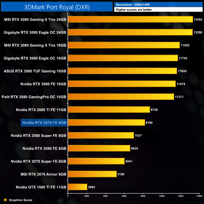 Port Royal is the other 3DMark benchmark we look at, as this tests a GPU's ray tracing ability. While we look at this later in the review in more detail, here the RTX 3070 falls short of the RTX 2080 Ti by 6%. Compared to the RTX 2070 though, it's 58% faster in this test.