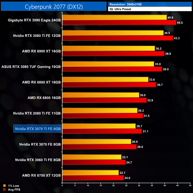 Up at 4K the gap between the 3070 and 3070 Ti shrinks slightly, with a 7% difference between the two, although that is only 2FPS in the real world. The 3070 Ti is also 2FPS behind the RX 6800, but realistically you're going to want a more powerful GPU for 4K gaming in Cyberpunk 2077.