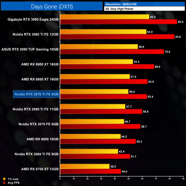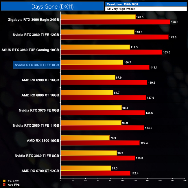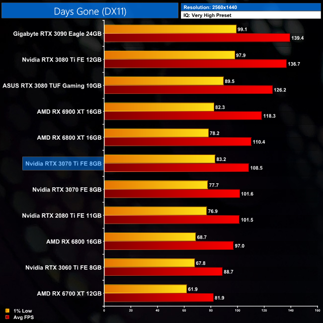 Next up is Days Gone, the most recently released game of the twelve we are testing today. At 1440p, the RTX 3070 Ti delivers its best result over the RX 6800 that we will see across all twelve games, as it's 12% faster, averaging 109FPS. The 3070 Ti is also 7% faster than the vanilla 3070, which still isn't a massive difference.