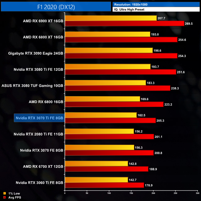 Moving onto F1 2020, the differences between the 3070 and the 3070 Ti are much more muted here. At 1440p for instance, the 3070 Ti is just 3% faster, averaging 162FPS compared to 157FPS for the RTX 3070, which isn't something I think you'd be able to notice when gaming. The RX 6800 does well in this title too, as we can see the 3070 Ti is 9% slower at 1440p.