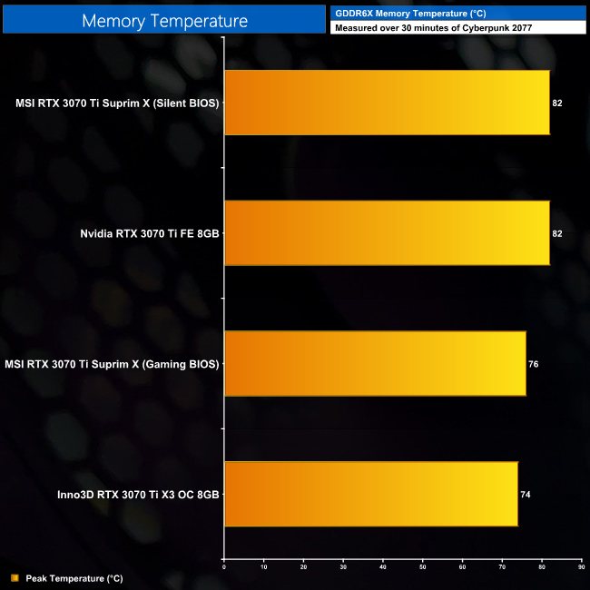 As for memory temperatures, the immediate good news is that Nvidia has done a much better job cooling the GDDR6X on the RTX 3070 Ti, as it peaked at just 82C on our sample. Contrast that with the RTX 3080 Ti, which saw the memory hit 96C, and this is a big improvement. The Suprim X's Silent BIOS meanwhile saw the memory hit the same temperature as the Founders Edition, but switching to the Gaming BIOS dropped that by 6C. Interestingly, the X3 OC did best here, with a peak memory temperature of just 74C.