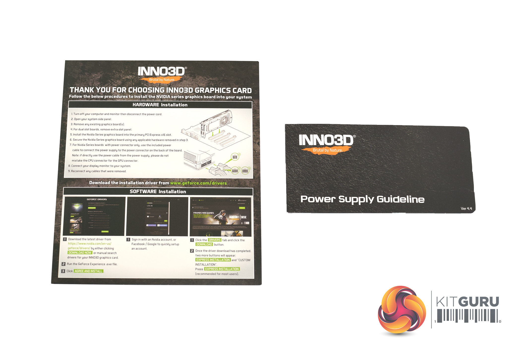 Looking now at the Inno3D RTX 3070 Ti X3 OC, this ships in an eye-catching box, though no image of the card is visible on the front. Inside, the only included accessories are a couple pieces of documentation.