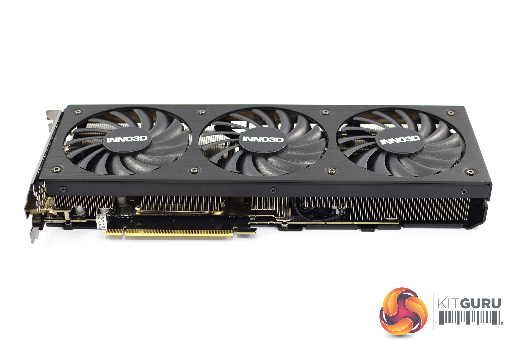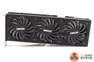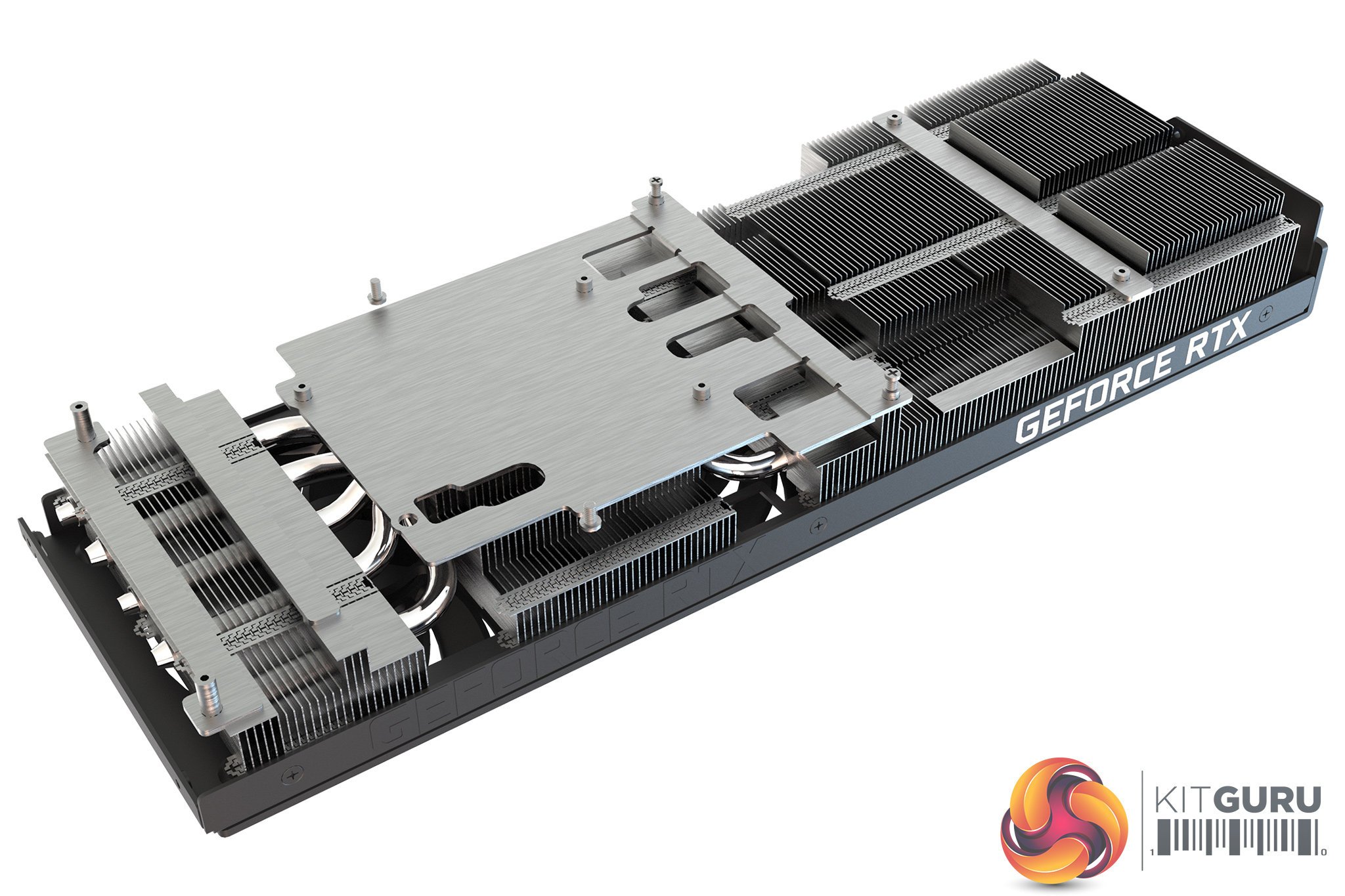 Looking now at the cooler, Inno3D is using three finstacks connected by a total of 5 heatpipes. The GPU and memory contact with a central baseplate, while there are secondary plates to cool the VRM.