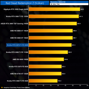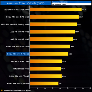 As for 4K, power draw is pretty consistent at this resolution, with the exception of Assassin's Creed Valhalla, and we see a 12-game average of 285W. That's really not far off the power draw of both the RX 6800 XT and 6900 XT, which are significantly faster cards, so I wouldn't say power consumption is a strong point for the RTX 3070 Ti.