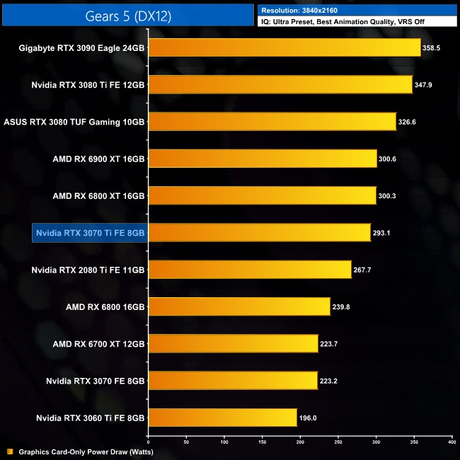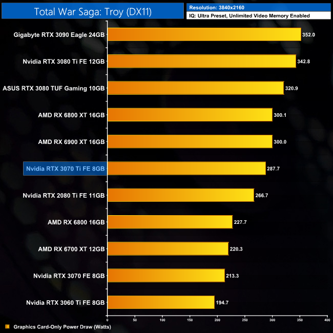 As for 4K, power draw is pretty consistent at this resolution, with the exception of Assassin's Creed Valhalla, and we see a 12-game average of 285W. That's really not far off the power draw of both the RX 6800 XT and 6900 XT, which are significantly faster cards, so I wouldn't say power consumption is a strong point for the RTX 3070 Ti.