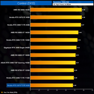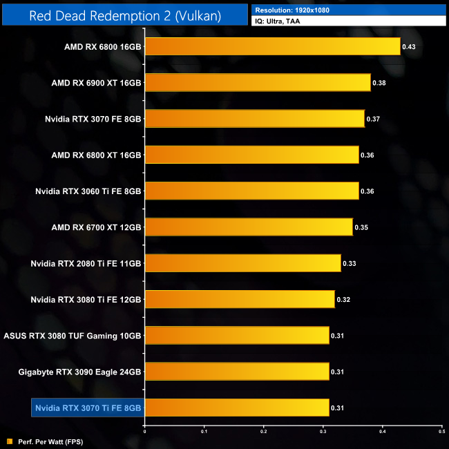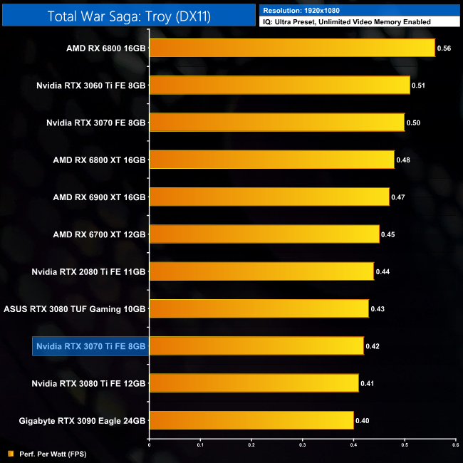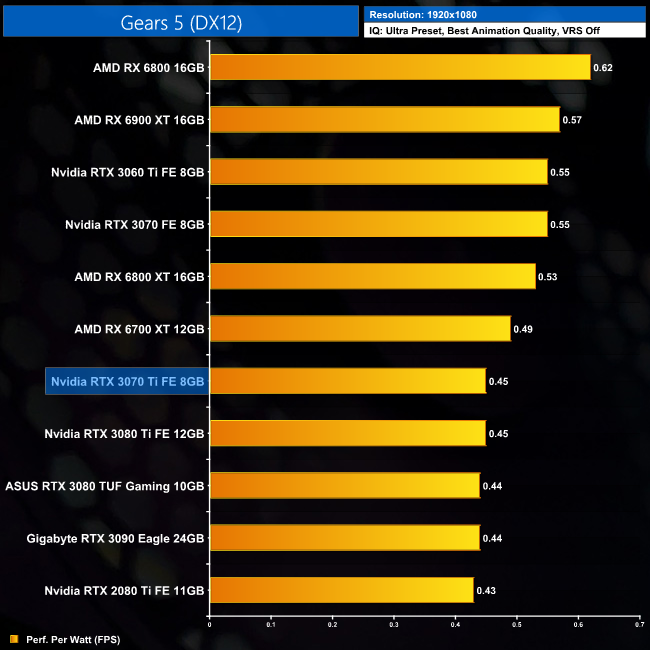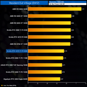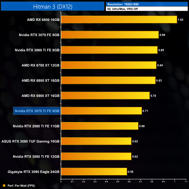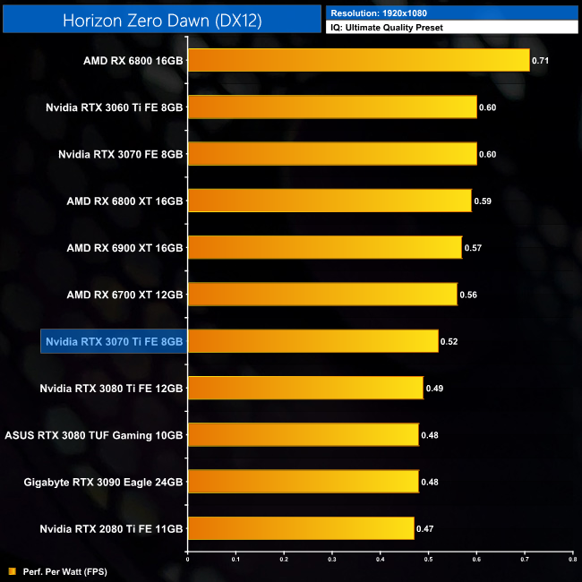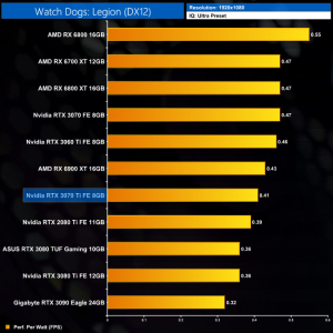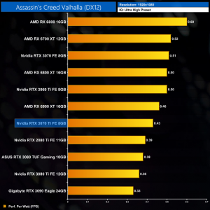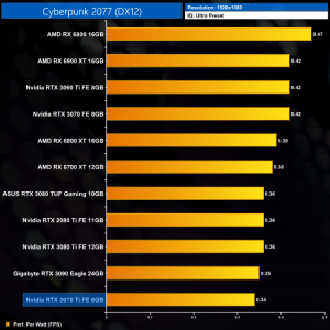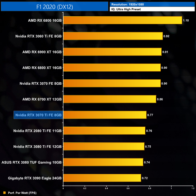 Looking now at performance per Watt at 1080p, there is a clear gap between the RTX 3070 Ti and the cards in the top half of our chart. The RTX 3070, for instance, is 18% more efficient on average, while the RX 6800 is in a league of its own, offering 35% more performance per Watt.