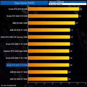 Using the graphics card-only power draw figures presented earlier in the review, here we present performance per Watt on a per-game basis for all twelve games we tested at 1080p.