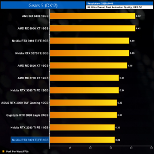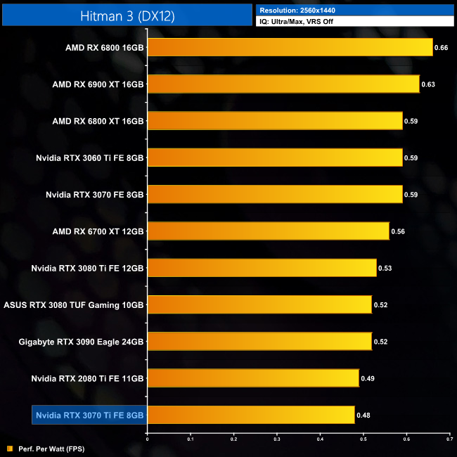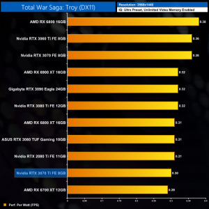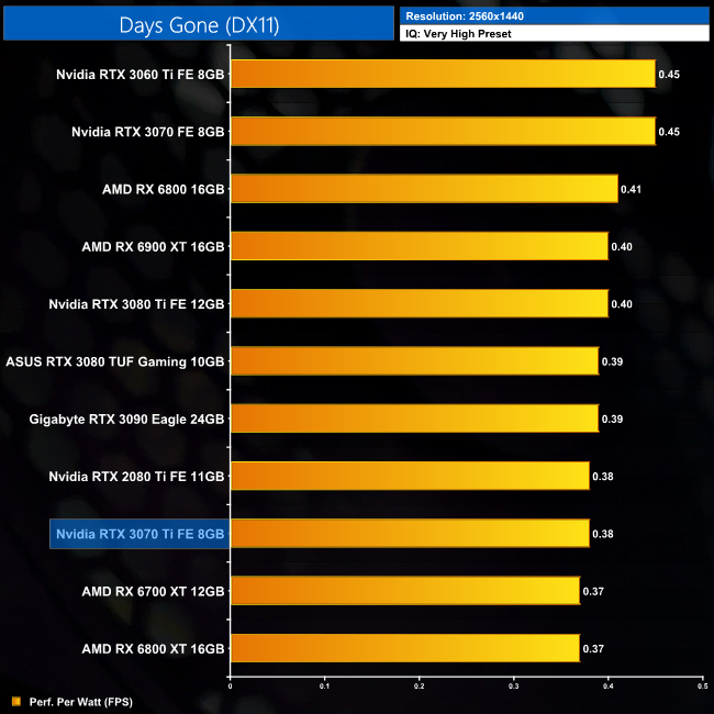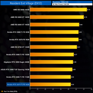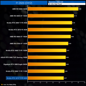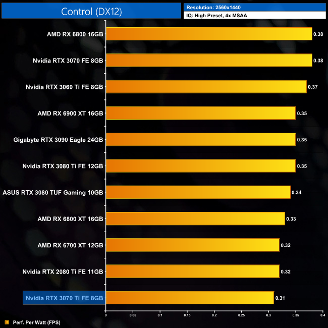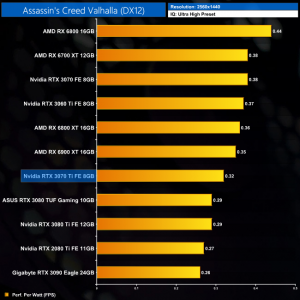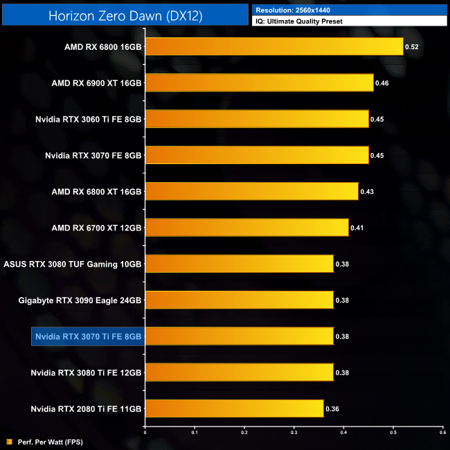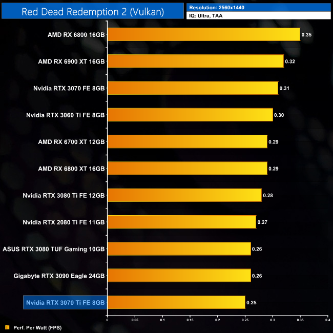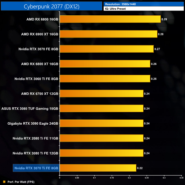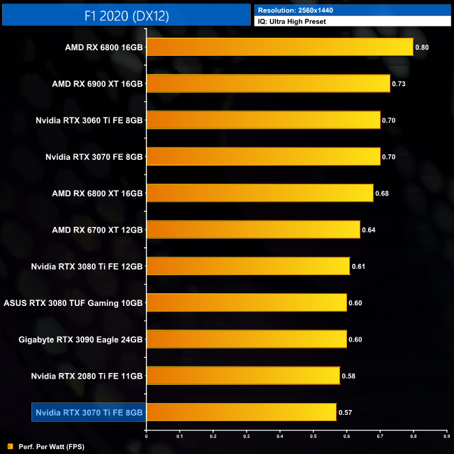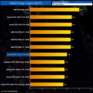 As we step up in resolution, the RTX 3070 Ti roots itself to the bottom of our chart, level with the RTX 2080 Ti. Its high power draw coupled with fairly insignificant performance improvements mean the RTX 3070 is 22% more efficient, while the RX 6800 offers 33% better performance per Watt.