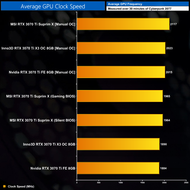 Despite inputting similar core offsets, the MSI Suprim X was easily the best overclocker of the three cards. It was able to hold its frequency over 2100MHz, which is very impressive for an RTX 30-series GPU, while the other two cards hovered around the 2020MHz level.