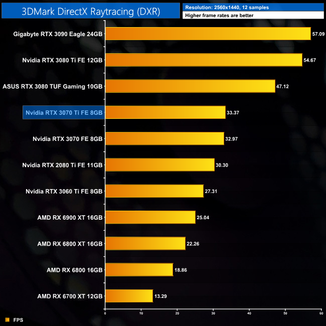 3DMarks' DXR feature-test is a tough test of a GPU's ray tracing abilities. Despite the significant increase to memory bandwidth, the RTX 3070 Ti only has an extra two RT cores compared to the RTX 3070, and is just 1% faster in this test.