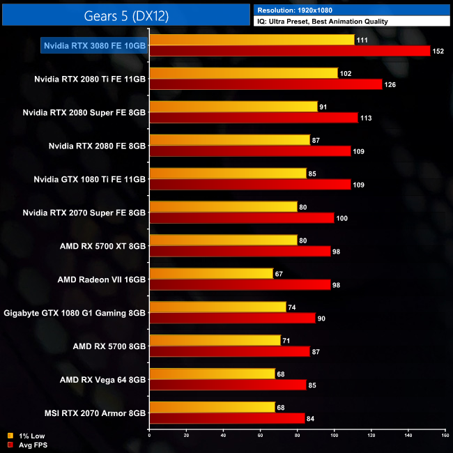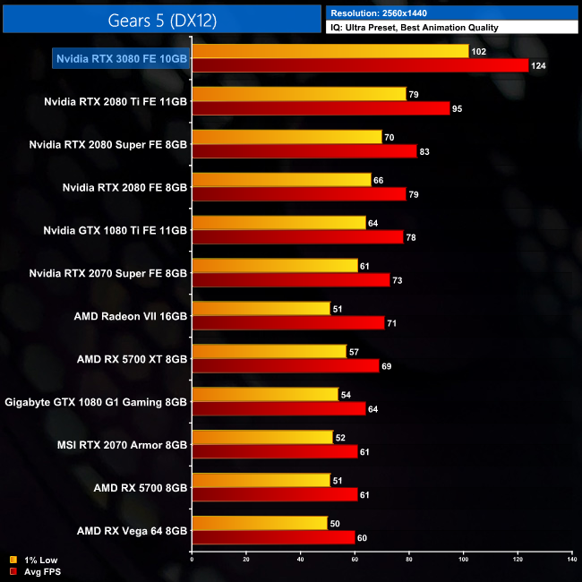 Gears 5 is another AMD title, but Nvidia cards still occupy the top half of the chart. At 1440p, the RTX 3080 delivers over 120FPS on average, another 31% increase over the RTX 2080 Ti, while it's 57% ahead of the 2080.