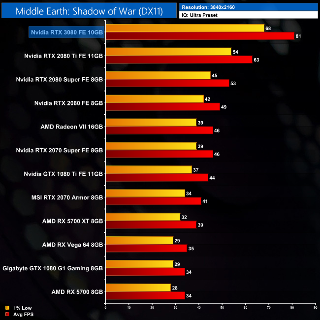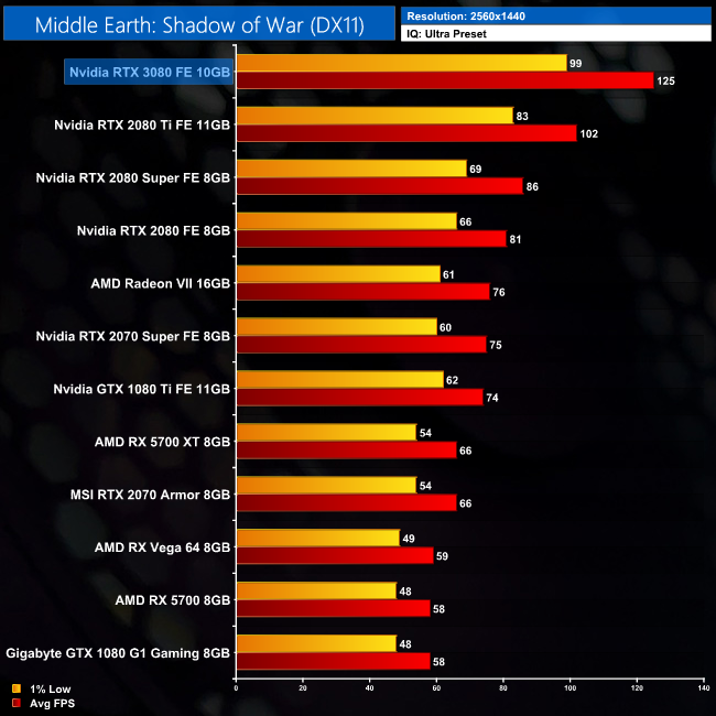 Moving onto Shadow of War, despite being nearly three years old this is still a pretty intensive DX11 title. Even then, the RTX 3080 continues its strong performance, averaging 125FPS at 1440p, with a 54% performance lead over the RTX 2080.