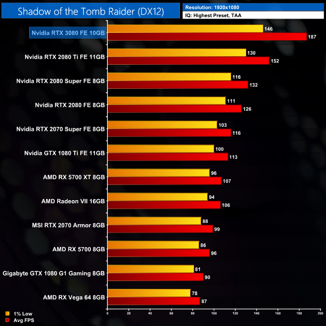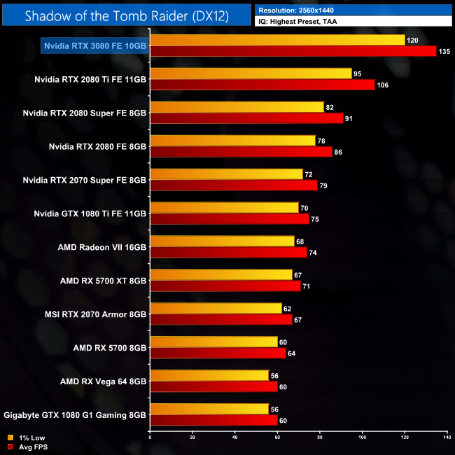 Our penultimate game of the day is Shadow of the Tomb Raider, one of the first games to be announced with RTX features. Here the 3080 solidifies its position as top dog, beating out the 2080 Ti by 27% at 1440p.