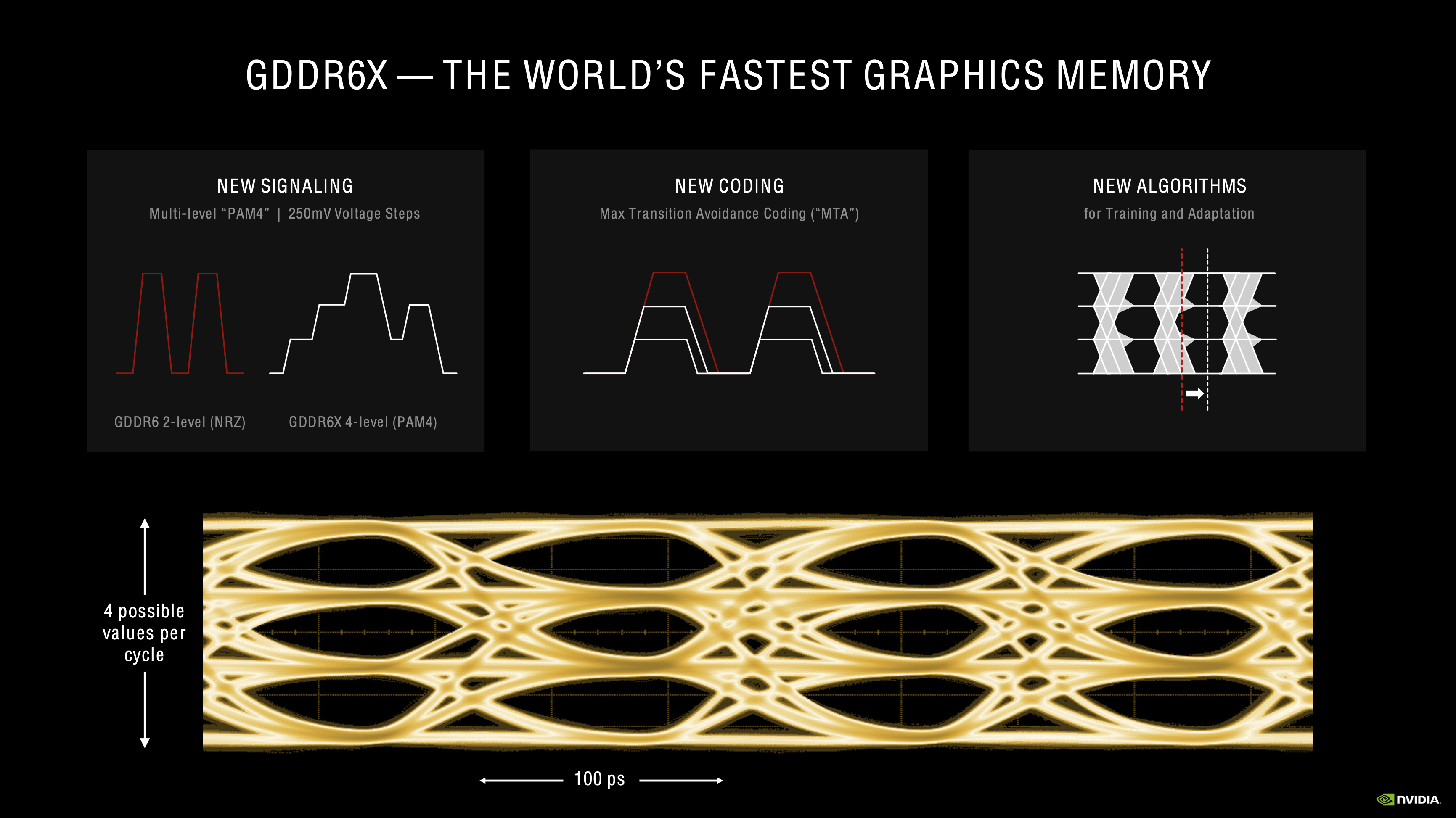 Another step forward is the use of GDDR6X memory with the RTX 3080 and RTX 3090, though the RTX 3070 will remain on GDDR6. Developed in collaboration with Micron, GDDR6X uses new 4-level Pulse Amplitude Modulation (PAM4) signalling instead of the previous 2-level NRZ signalling that is used with GDDR6 (non-X). Where NRZ signalling can only send binary data, PAM4 – as the name suggests – can send one of our voltage levels, in steps of 250 mV, per clock cycle. Nvidia claims this allows GDDR6X to ‘transmit twice as much data as GDDR6' memory.